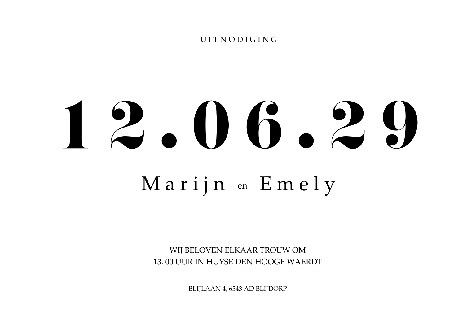 Moderne basic trouwkaart in zwart wit waarop de datum van jullie huwelijk een echte eyecatcher is. De kaart oogt clean en rustig en is naar je eigen wensen aan te passen.