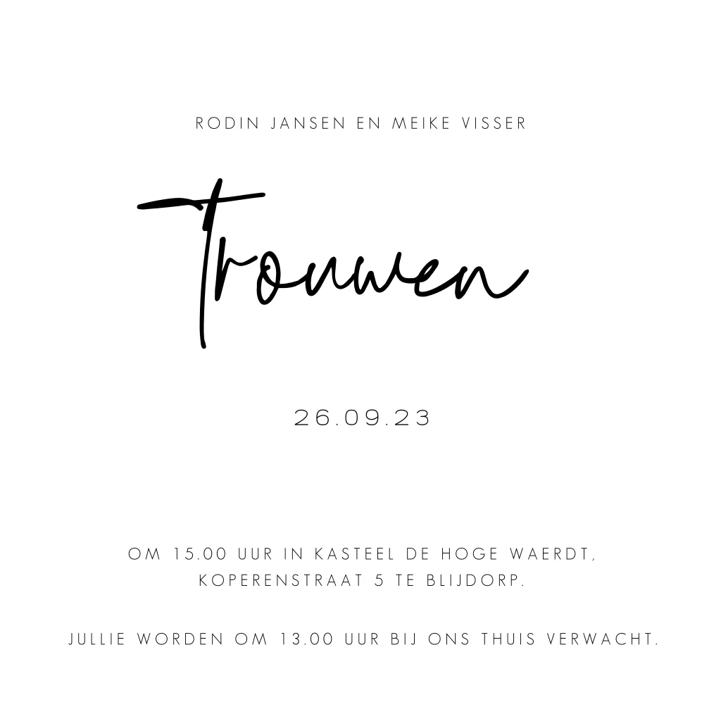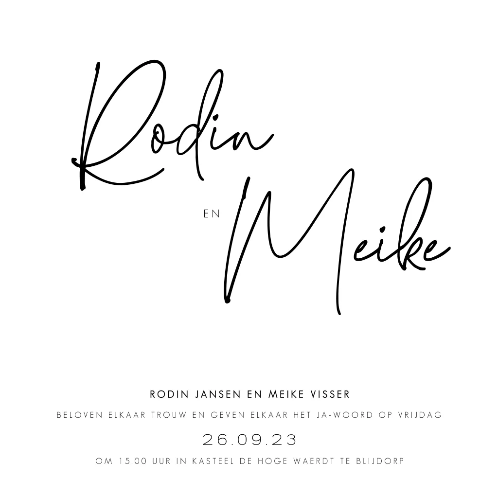 Basic trouwkaart in zwart wit. Op deze huwelijksuitnodiging is een strak lettertype gecombineerd met een sierlijk lettertype. De namen van het bruidspaar komen mooi naar voren. Verder is de kaart rustig en clean. Teksten pas je eenvoudig aan in de editor om zo je eigen persoonlijke trouwkaart te maken.