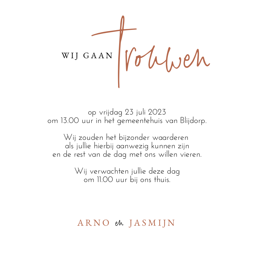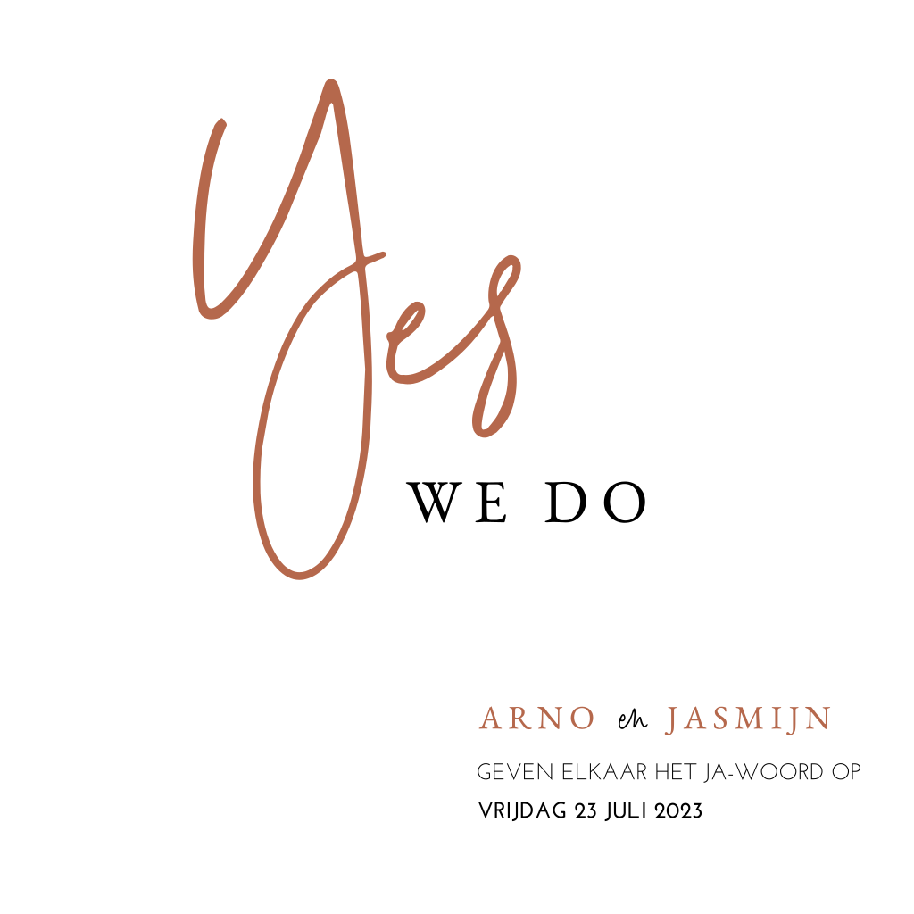 Basic en cleane trouwkaart met op de voorzijde de tekst Yes We do. Deze huwelijksuitnodiging heeft een sierlijk en speels lettertype in de trendy kleur roestbruin. Verder is de kaart rustig en overwegend wit.