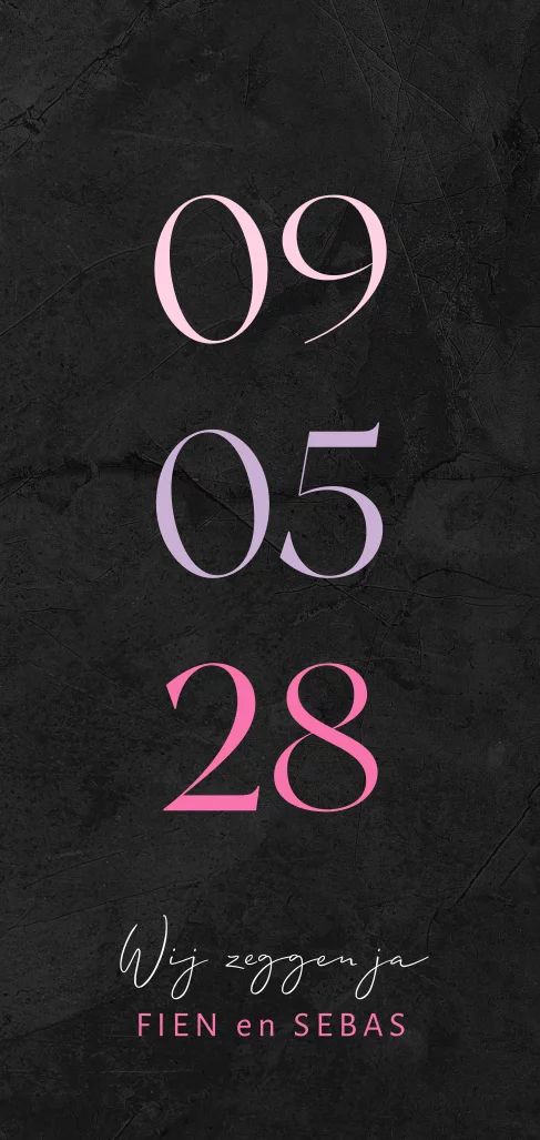 Hippe trouwkaart met datum en ronde hoeken. Deze trouwkaart heeft een zwarte betonlook achtergrond met datum en tekst in felle roze kleuren. Laat al je gasten met deze uitnodiging weten dat jullie gaan trouwen! De kaart heeft een langwerpig formaat met afgeronde hoeken waardoor deze net anders is dan andere vierkante kaarten. Pas deze kaart geheel naar eigen wens aan in de editor.