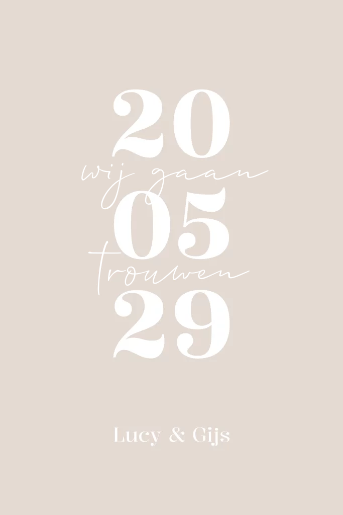 Stijlvolle trouwkaart met een basic design met foliedruk en afgeronde hoeken. Deze huwelijksuitnodiging heeft een eenvoudig design met een mooie beige achtergrond en witte letters. De witte letters en goudfolie vallen door de zachte achtergrond extra op.