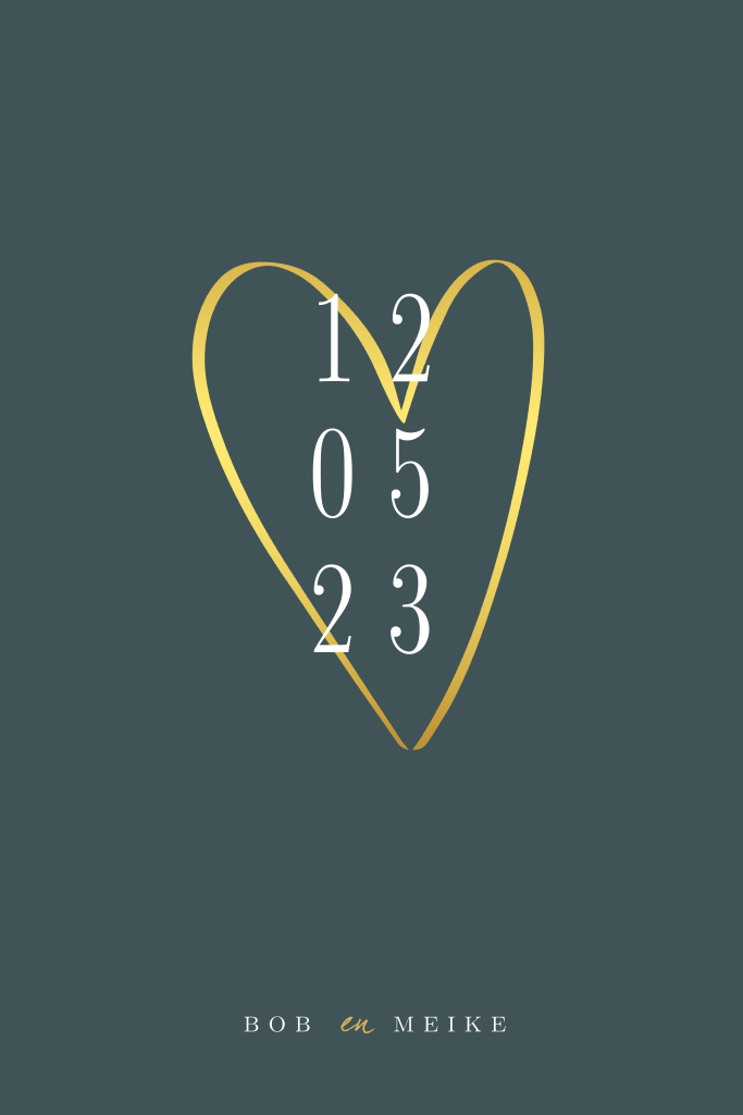 Basic trouwkaart in een warme donkergroene kleur gecombineerd met wit en goud. Op deze uitnodiging staat de datum van jullie huwelijk prominent op de voorzijde van de kaart. Daar omheen staat een groot goudkleurig hart. Op de binnenzijde wordt de dagindeling van jullie dag weergegeven met goudkleurige symbolen.