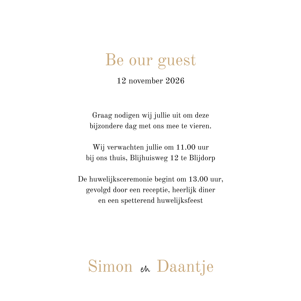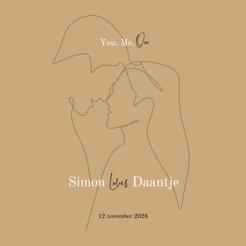 You, Me, Oui! Kondig jullie huwelijk aan met deze basic maar hippe uitnodiging. Op deze trouwkaart staat een lijntekening van een liefdeskoppel. De achtergrond kleur is een trendy bruin tint. De teksten en kleuren zijn aan te passen in de editor.