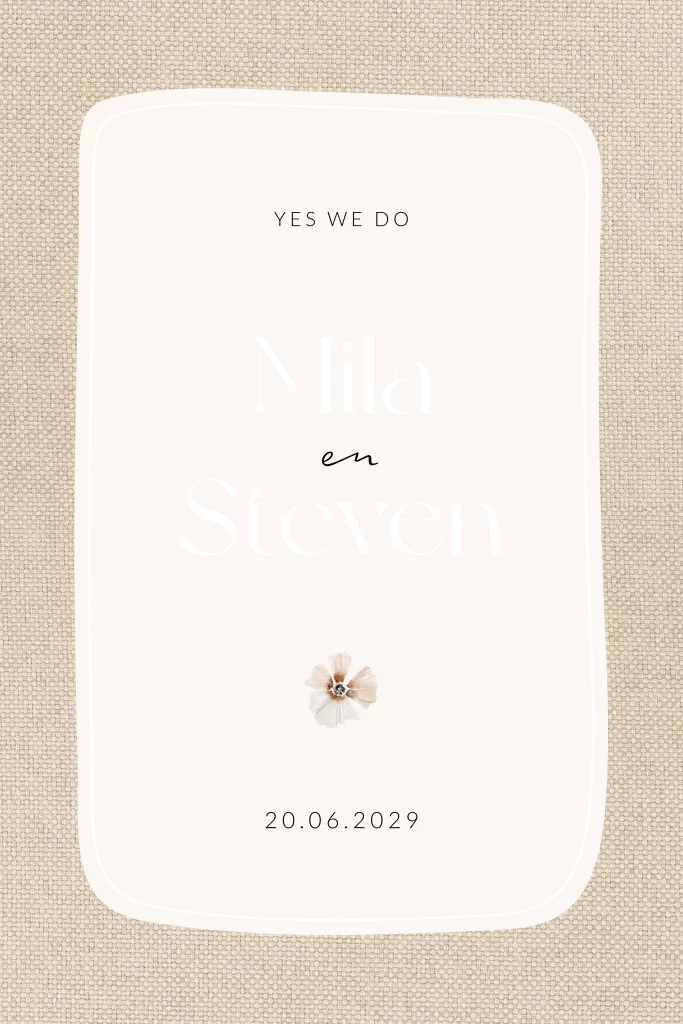 Rustige en stijlvolle trouwkaart met organisch kader in losse vorm en bloem. Deze trouwkaart is voorzien van een linnenlook achtergrond met een beige kader. Zet in het kader jullie namen in prachtig goudfolie. Foliedruk trouwkaarten zijn een echte eyecatcher en staan garant voor een unieke uitstraling!