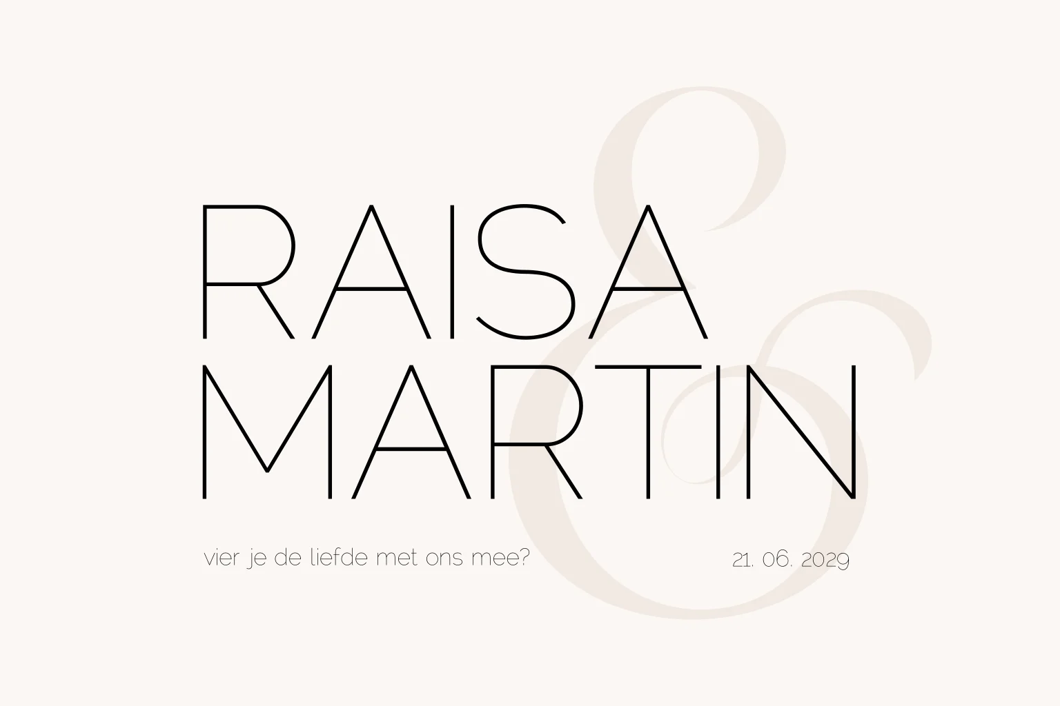 Rustige trouwkaart met een basic ontwerp. Op deze trouwkaart zie je een ampersand &-teken en in het groot de namen van het bruidspaar. Deze huwelijksuitnodiging is eenvoudig maar stijlvol door de lichte kleuren en rustige opmaak. Pas in onze online editor deze kaart naar eigen wens aan en vier de liefde.