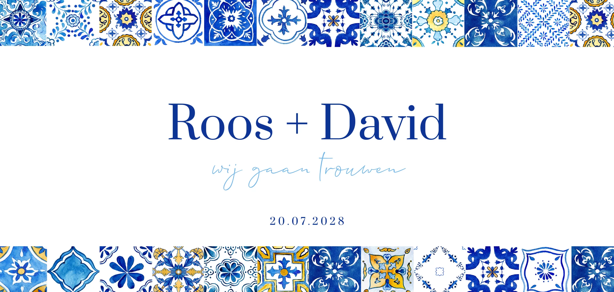 Zoek je een vrolijke zomerse trouwkaart? Dan is deze trouwkaart met Portugese tegels wellicht iets voor jou! De kaart is overwegend wit, met een leuk patroon van blauw gele mediterrane tegels. De tekst is aanpasbaar, zodat je deze helemaal naar eigen wens kunt invullen.