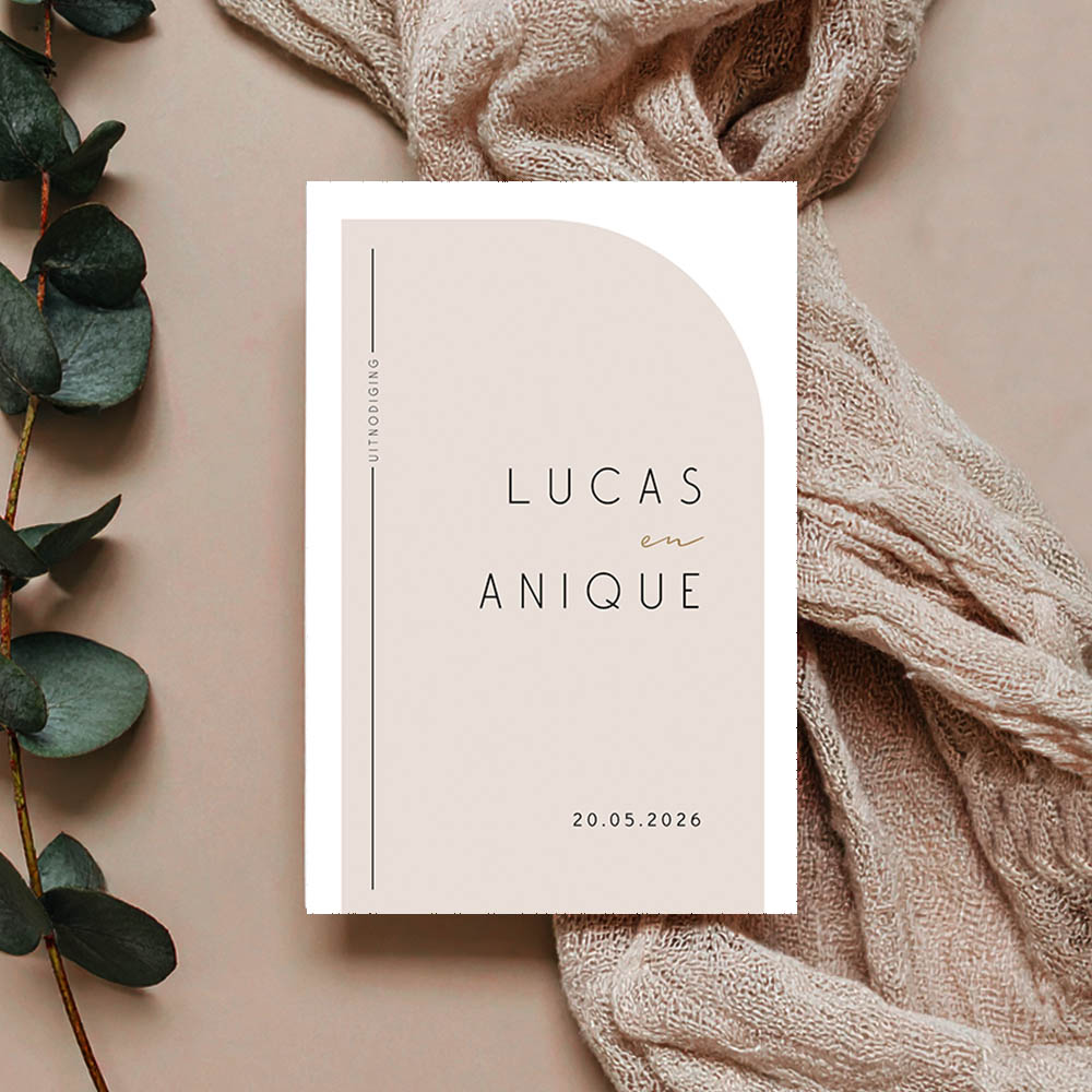 Strakke trouwkaart met een basic design. Deze trouwkaart heeft rustige zachte kleuren met een halve boog waarin de teksten staan. Pas de teksten, kleuren en lettertypes eenvoudig aan in de editor.| Totaalprijs: 0 |