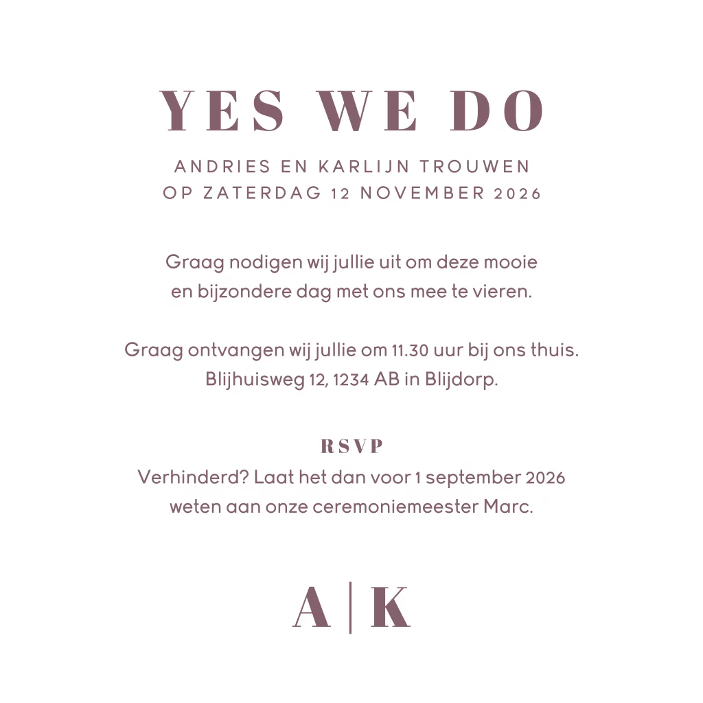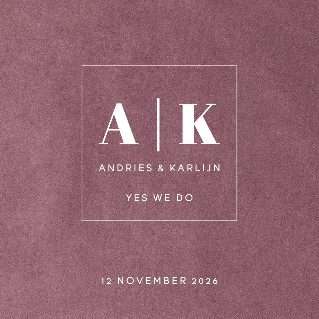 Een basic huwelijksuitnodiging om de dag van jullie dromen aan te kondigen; dé trouwdag! Op deze trouwkaart jullie eigen initialen, namen en "Yes we do" in een kader. Op de achtergrond velvetlook, wat een zacht ogend effect geeft. Kleuren, teksten en lettertypes pas je eenvoudig aan in onze editor.