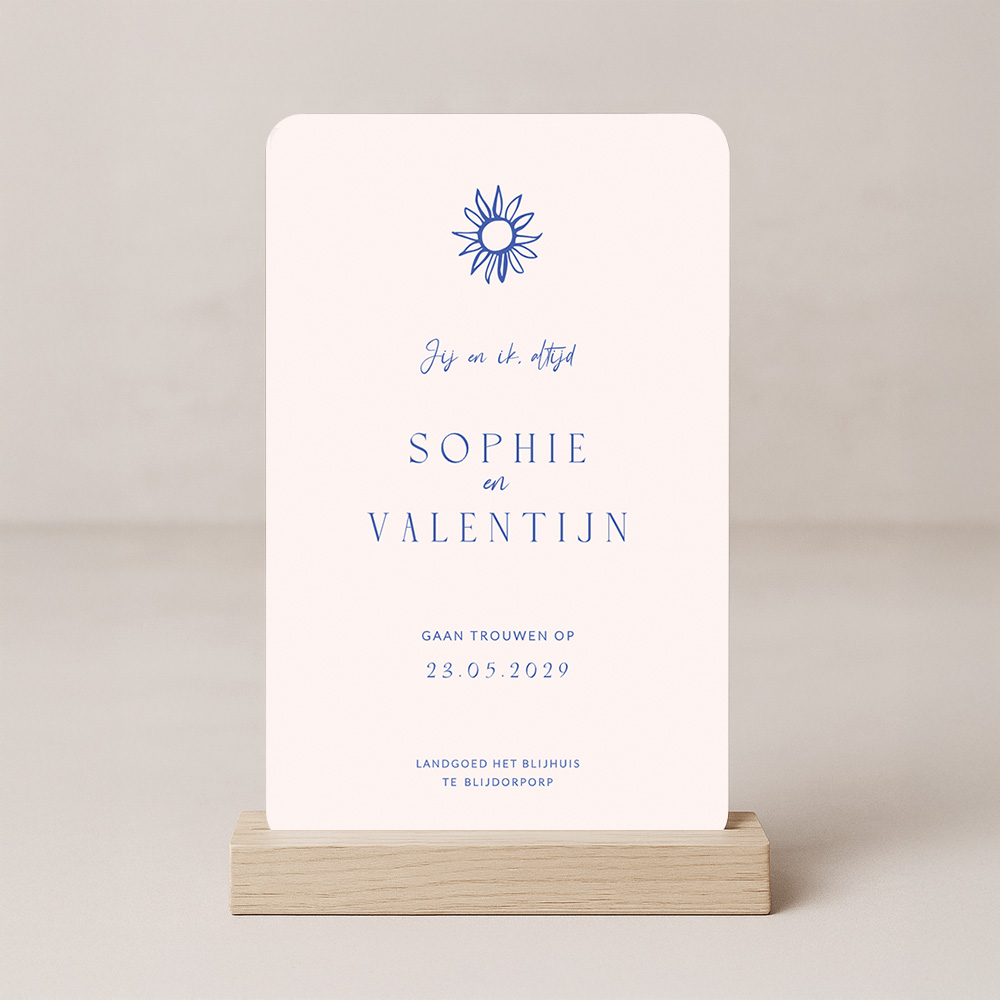 Rustige basic trouwkaart met een zon en de tekst 'Jij en ik, altijd'. Deze trouwuitnodiging heeft een beige achtergrondkleur met een blauwe zon en tekst. De ronde hoeken maken de uitnodiging helemaal af.| Totaalprijs: 0 |