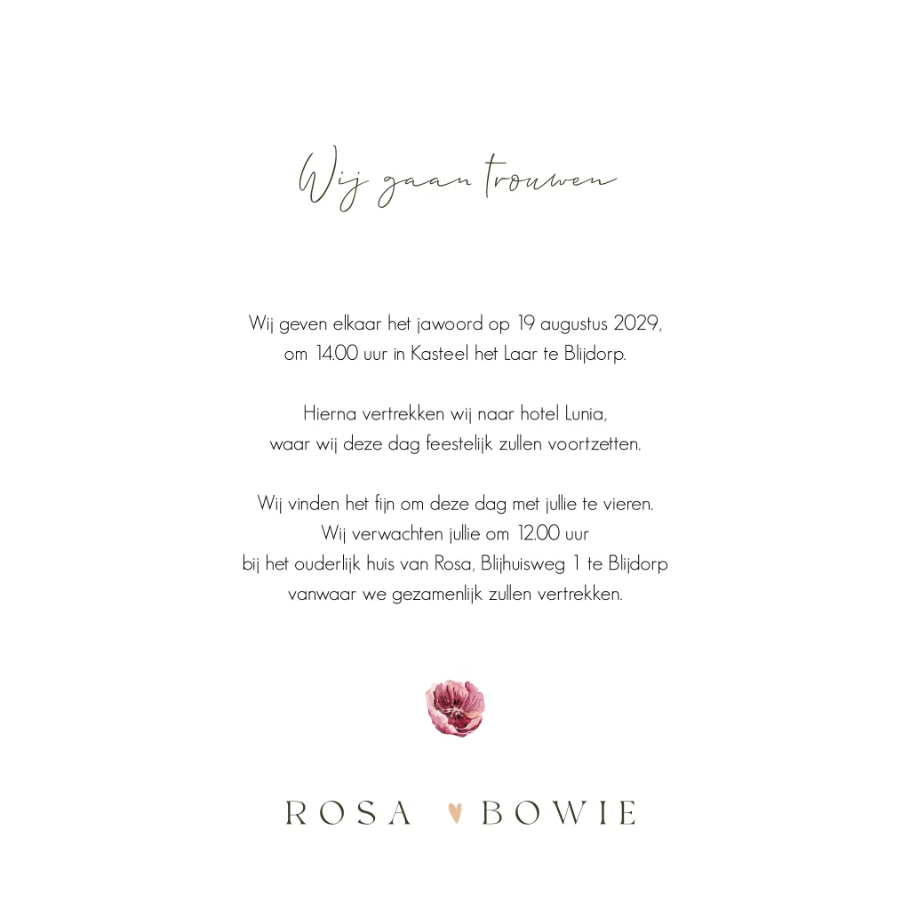 Op zoek naar een prachtige trouwkaart met een vleugje romantiek? Ontdek dan deze trouwkaart met aquarel bloemen en hartjes! De subtiele kleurtinten van de bloemen zorgen voor een stijlvolle trouwkaart. Met deze kaart als basis kunnen jullie alle kanten op. Pas deze kaart naar eigen wens aan in onze online editor en maak de uitnodiging in stijl af met de donkergroene envelop.