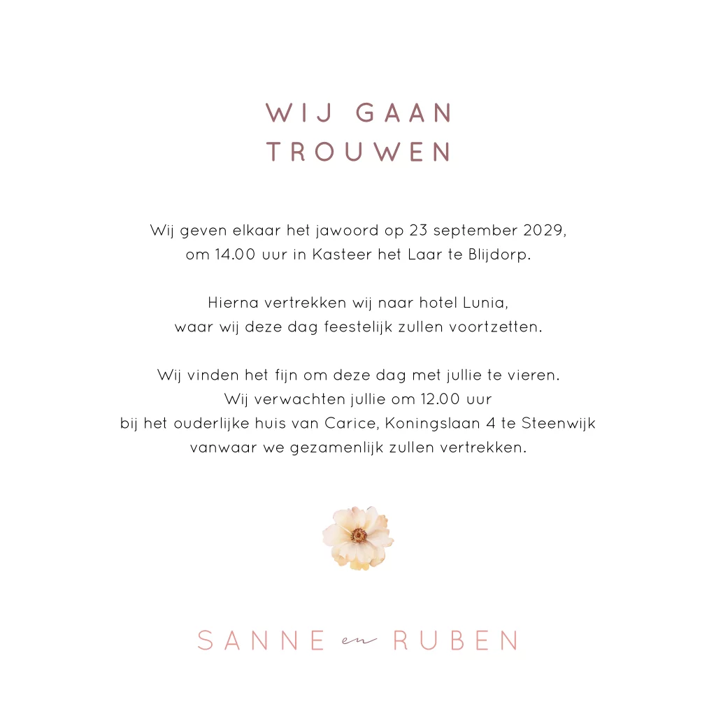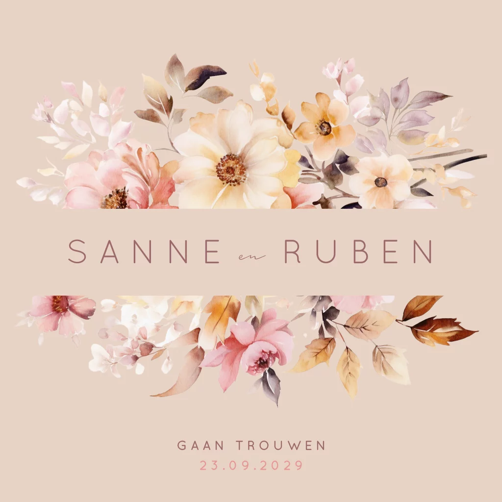 Prachtige kaart met bloemen en een kader voor jullie namen. Dit is een romantische trouwkaart die ideaal is voor het aankondigen van jullie trouwdag. De geïllustreerde bloemen zorgen voor een romantische stijl. Pas deze trouwkaart naar eigen wens aan in onze online editor en maak er een onvergetelijke trouwdag van.