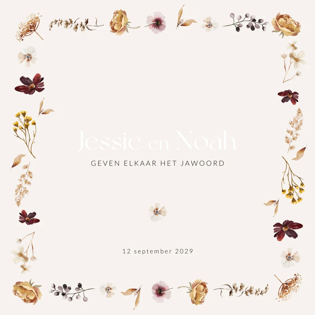 Klassieke trouwkaart met aquarel bloemen en foliedruk. De bloemen hebben lichte met donkere kleuren waardoor deze trouwkaart ook zeker geschikt is voor een herfstbruiloft! Pas de teksten, lettertypes en kleuren eenvoudig aan in de editor. Hulp nodig bij het ontwerpen? Neem contact met ons op!