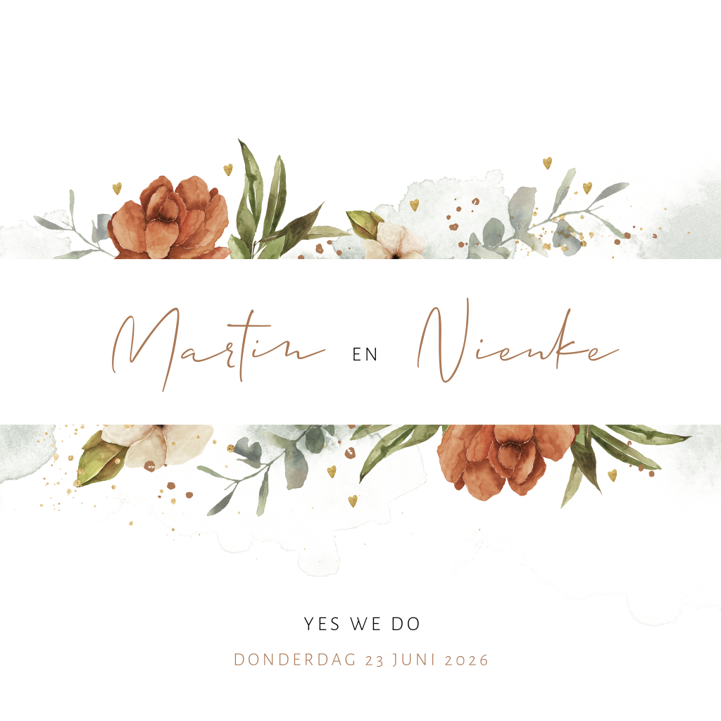 Stijlvolle trouwkaart met trendy aquarel bloemen. De kaart is overwegend wit en oogt daardoor rustig. Over de bloemenprint staat een strak kader waarin de namen van het bruidspaar staan geschreven. Kleuren en lettertypes zijn aan te passen in de editor.