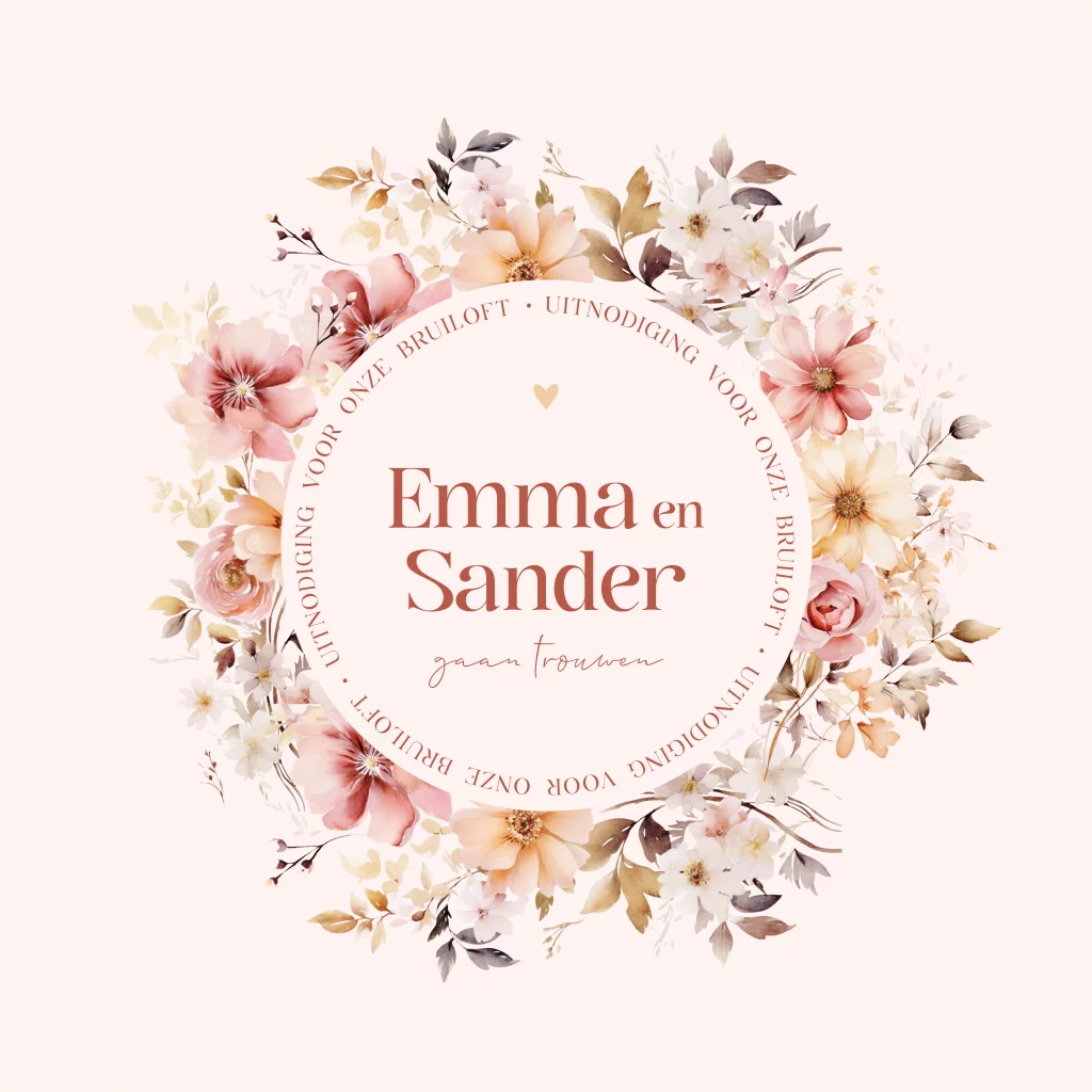 Romantische trouwkaart met bloemen rondom een rond kader met verschillende typografische teksten. Deze kwalitatieve maar niet dure uitnodiging is betaalbaar en extra voordelig vanwege het enkele vierkante formaat. Pas de teksten, lettertypes en kleuren eenvoudig aan in de editor. Hulp nodig bij het ontwerpen? Neem contact met ons op!