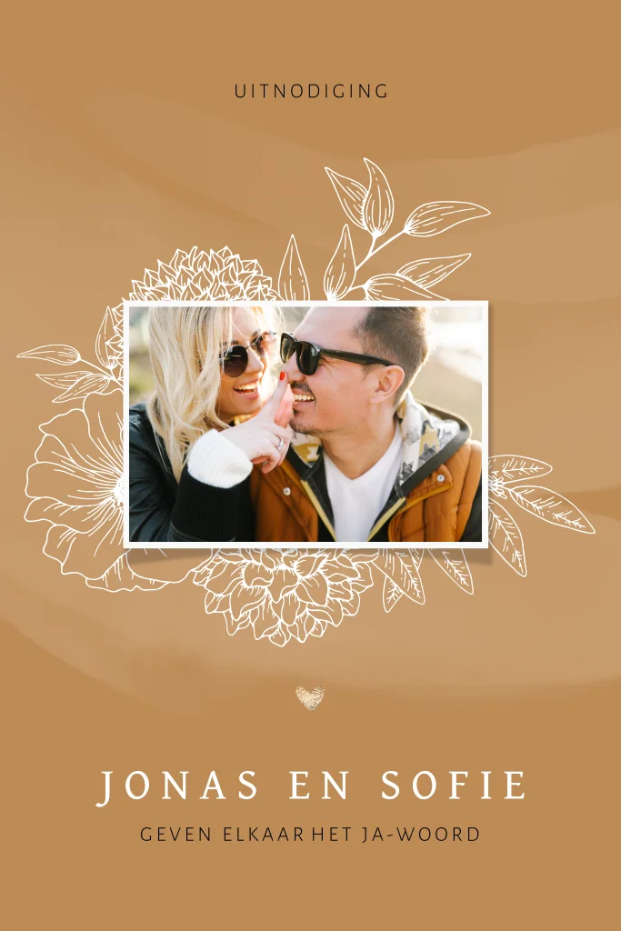 Hippe huwelijksuitnodiging met getekende bloemen. De namen van het bruidspaar staat in een lettertype geschreven. Een mooie foto van jullie zelf maakt deze kaart helemaal af!