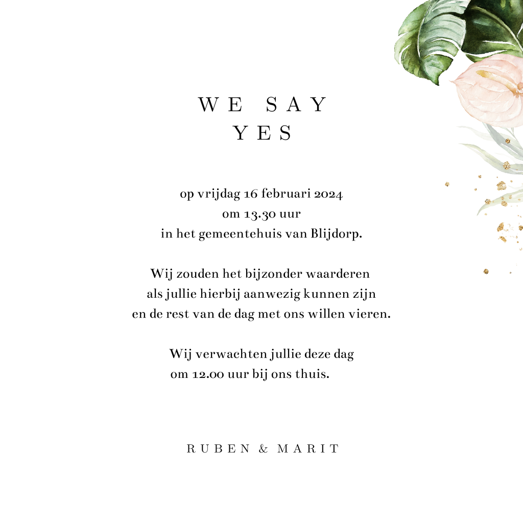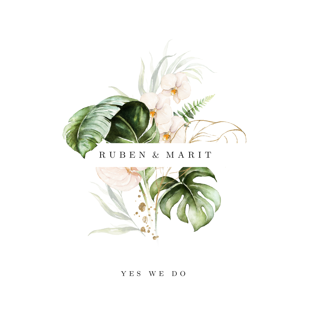 Kondig jullie huwelijk aan met deze mooie romantische trouwkaart met handgeschilderde bloemen, waaronder een orchidee en palmbladeren. Liever andere kleuren of lettertypes? Dit is gemakkelijk aan te passen in de editor.