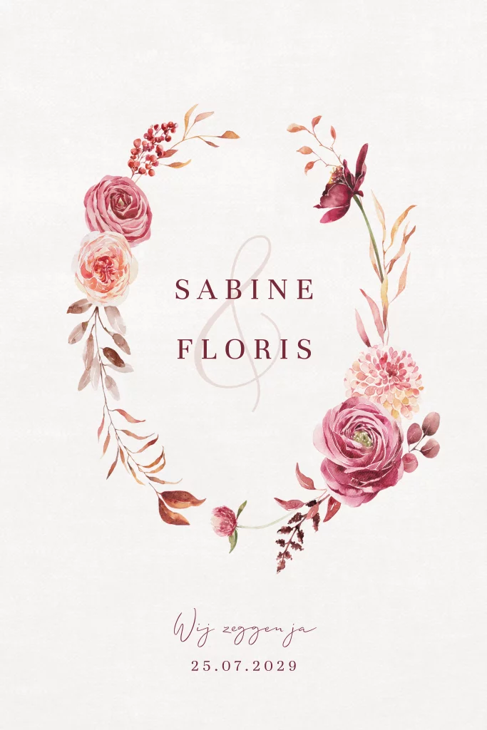Een romantische trouwkaart met een kader vol geïllustreerde aquarel bloemen. In het kader zie je de naam van het bruidspaar staan met een & teken. De achtergrond is voorzien van een subtiele linnenlook. Pas deze trouwkaart met bloemen naar eigen wens aan in onze online editor en maak er een unieke huwelijksuitnodiging van.