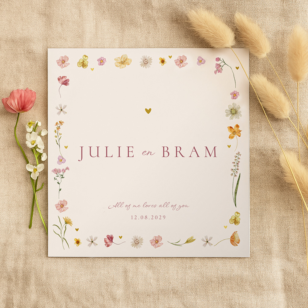 Een romantische trouwkaart met een bloemen kader en een klein hartje. Op deze kaart staan de namen van het bruidspaar en de tekst 'All of me loves all of you' en de trouwdatum. Pas alles geheel naar eigen wens aan in de editor. Het goudfolie zorgt voor een luxe touch. Hulp nodig? Ons team staat voor je klaar!