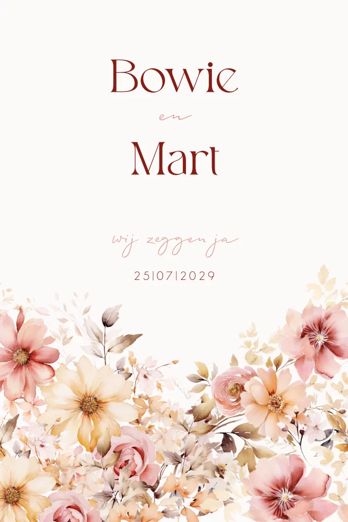 Deze trouwkaart is de perfecte keuze voor koppels die op zoek zijn naar een romantische uitnodiging voor hun speciale dag. De kaart bevat prachtige geïllustreerde bloemen. De envelop in de kleur berry voegt een vleugje elegantie toe aan de kaart. Met onze online editor kun je deze trouwkaart eenvoudig aanpassen naar jullie wensen.