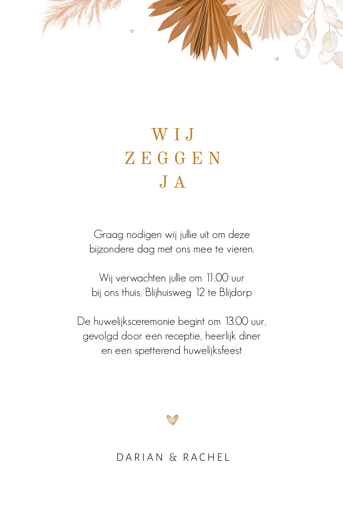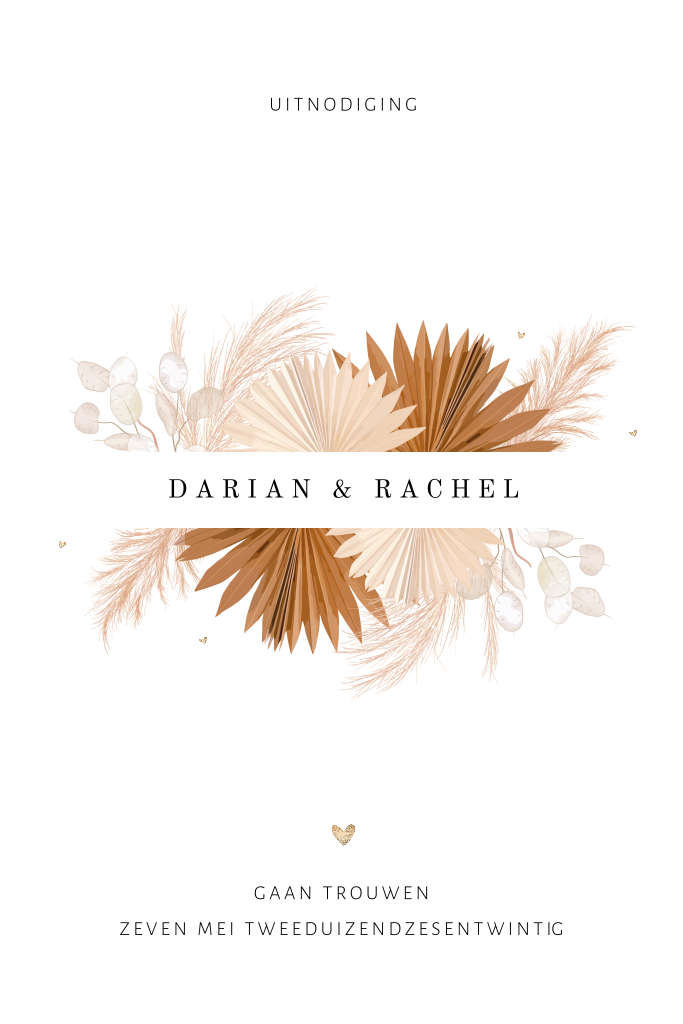 Stijlvolle en cleane trouwkaart met romantische bloemen. Lettertypes en teksten pas je gemakkelijk aan in de editor.