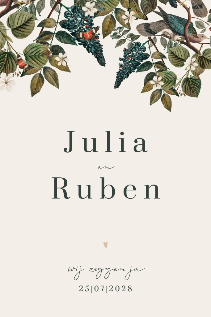 Deze trouwkaart is voorzien van een stijlvol botanisch ontwerp met bladeren en bloemen met beige achtergrond achtergrond. Subtiel is er een vlinder te vinden tussen de botanische vogels. Teksten en kleuren zijn aan te passen in onze editor.