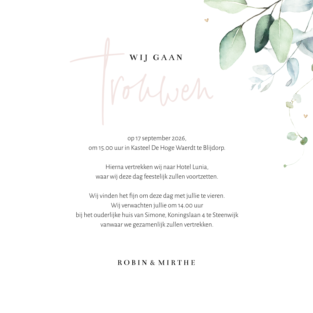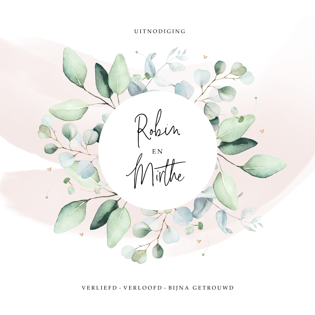 Kondig jullie huwelijk aan met deze botanische trouwkaart met eucalyptus. De namen van het bruidspaar staan in een mooi sierlijk lettertype in een cirkel en komen zo mooi naar voren. Kleuren en teksten zijn aan te passen in de editor.