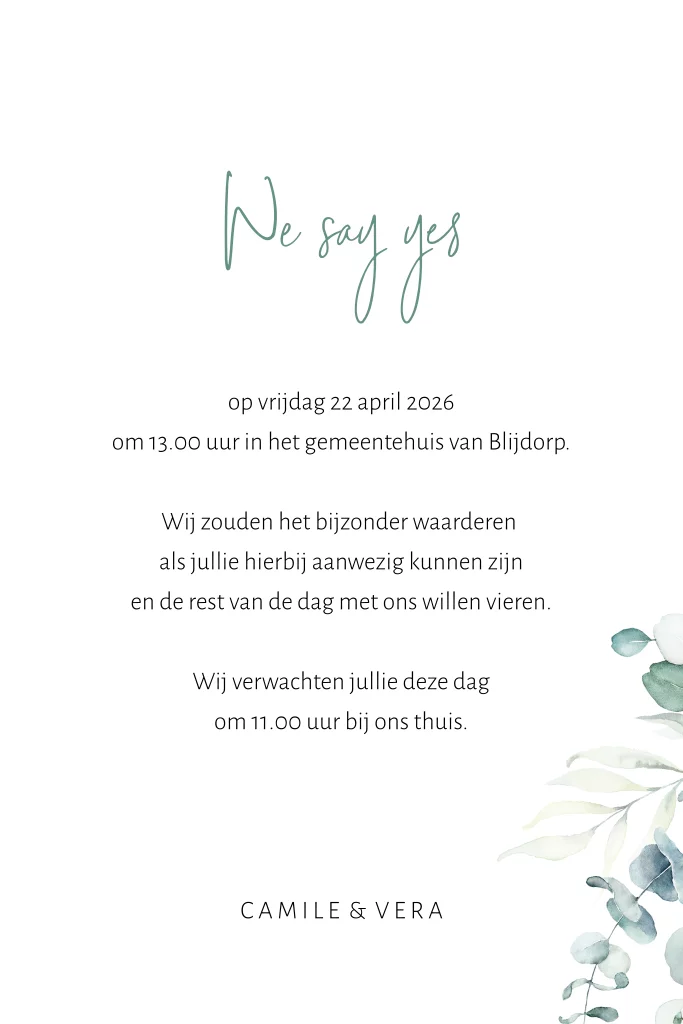 Hippe trouwkaart waar op de voorzijde de datum van jullie huwelijksdag meteen in het oog springt. De namen van het bruidspaar staan er in sierlijke letters tussen. Verder staan er op deze uitnodigingskaart botanische takjes met blad en goudkleurige bloemen. De teksten zijn gemakkelijk aan te passen.