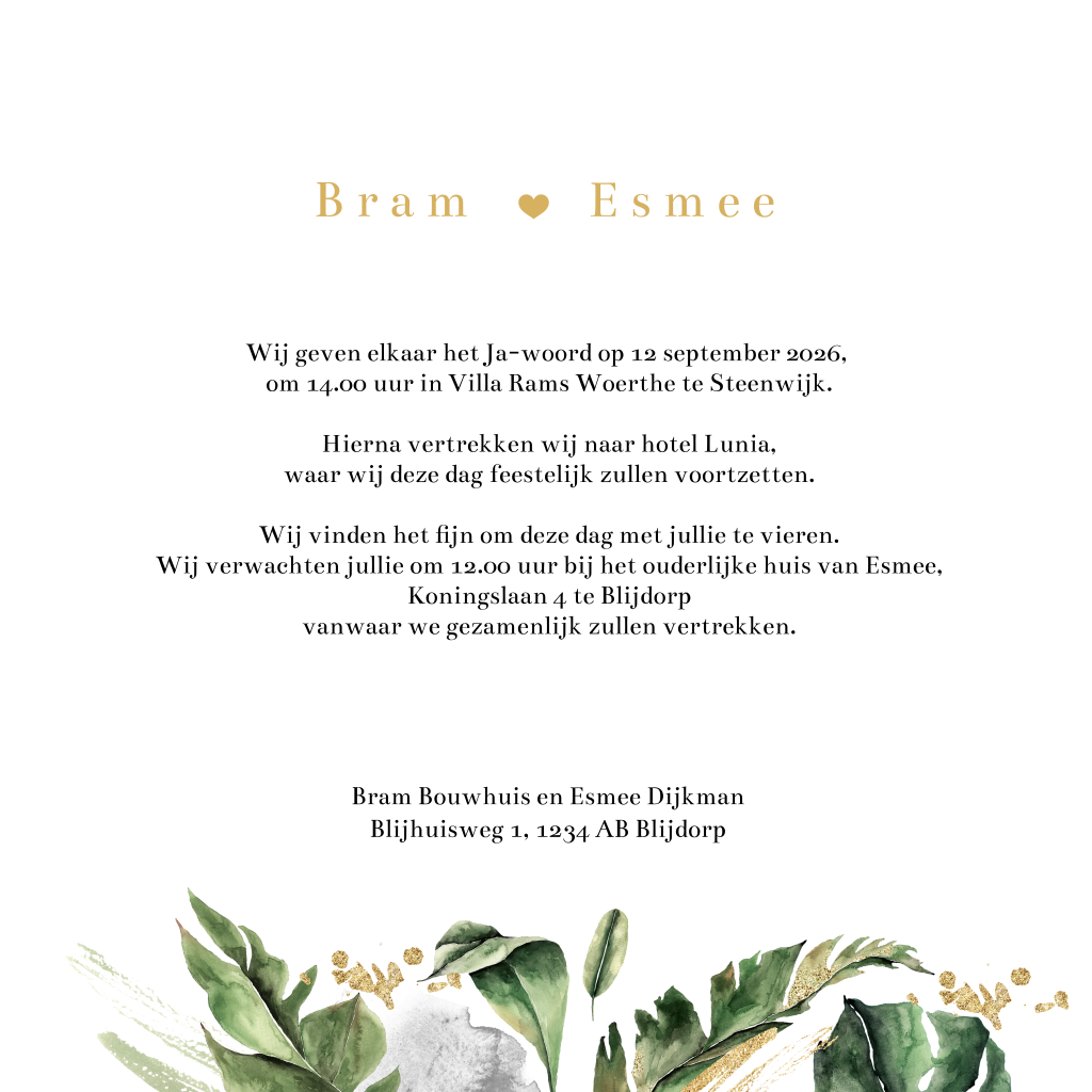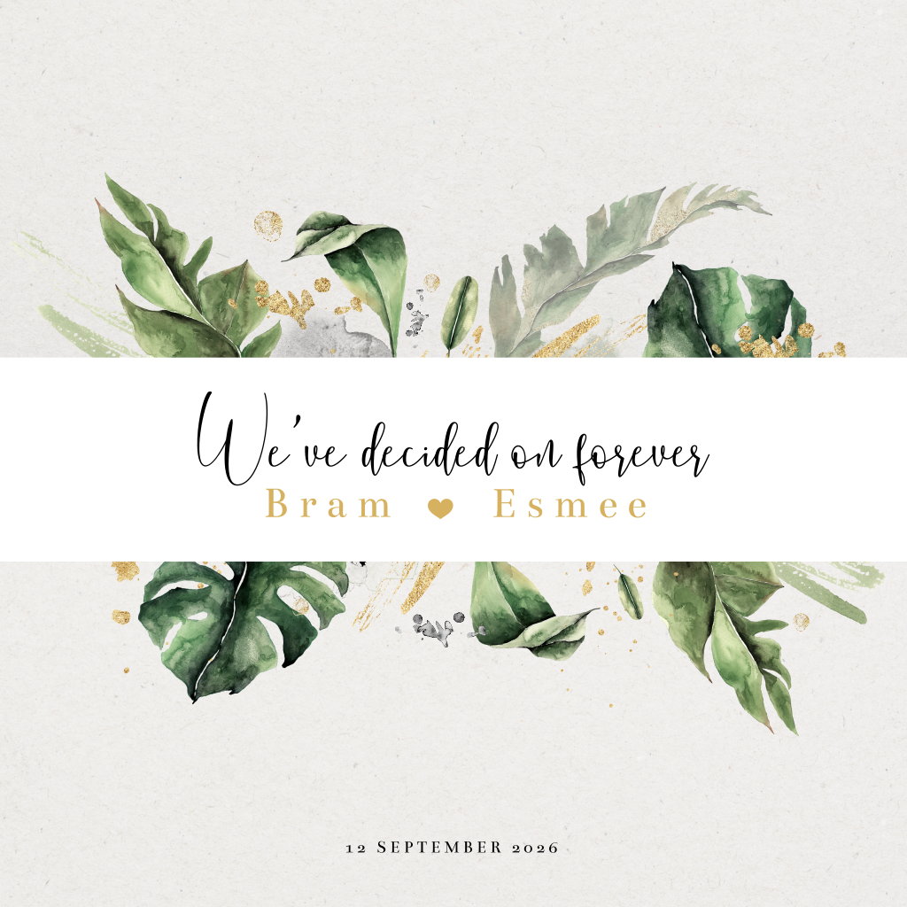 Hippe trouwkaart in botanische stijl met een karton achtergrond. Op de voorzijde staan de namen van het bruidspaar in een wit vlak samen met de tekst "We've decided on forever". Daar omheen staan mooie botanische bladeren, goudkleurige spetters en aquarel vegen. Pas de kleuren en teksten naar wens aan in de editor.