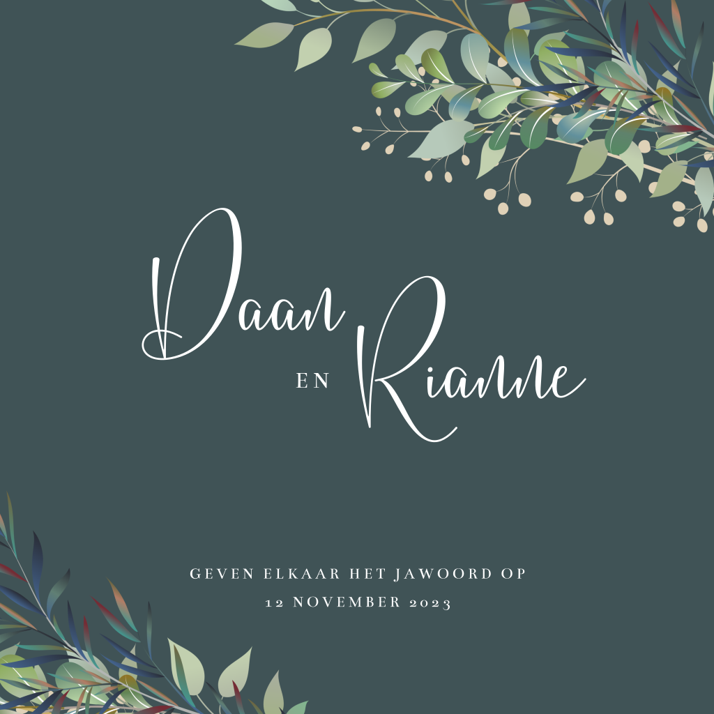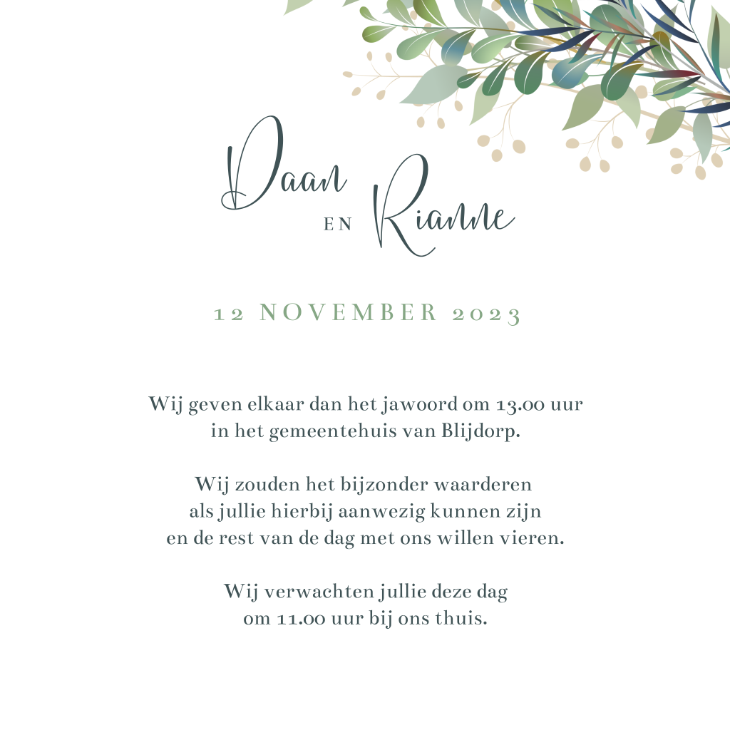 Deze stijlvolle trouwkaart met mooie groentinten is onderdeel van onze trouwhuisstijl Loving Leaves. Op deze huwelijksuitnodiging staan botanische takjes met blad en de namen staan in een elegant lettertype geschreven.