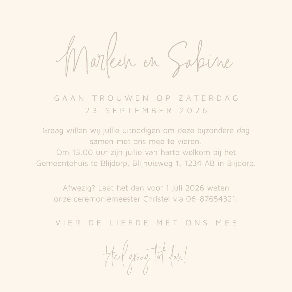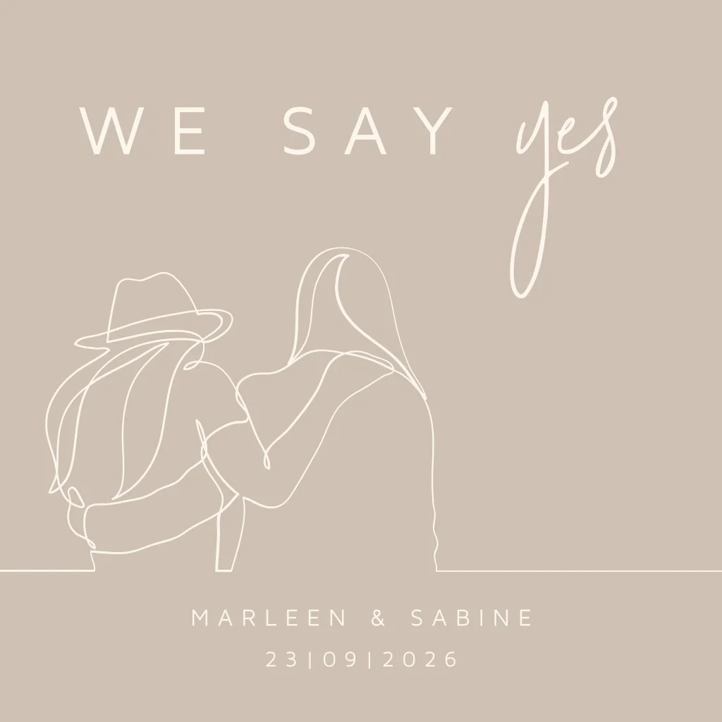 Super stijlvolle huwelijksuitnodiging met een lijntekening van twee vrouwen. Op deze basic trouwkaart de tekst "We say yes" in een mooie combinatie van strakke en sierlijke letters. Want YES gaan jullie zeggen, op de dag van jullie dromen!