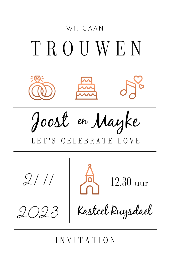 Typografische trouwkaart in wit met koperkleur. Deze huwelijksuitnodiging is onderdeel van onze trouwhuisstijl Celebration Symbols en heeft verschillende koper kleurige symbolen in de vorm van een kerk, ringen een taart en muzieknoten. De icoontjes geven jullie trouwkaart een persoonlijke stijl. Pas de teksten aan in onze editor en heb je hierbij hulp nodig dan helpen we je graag!