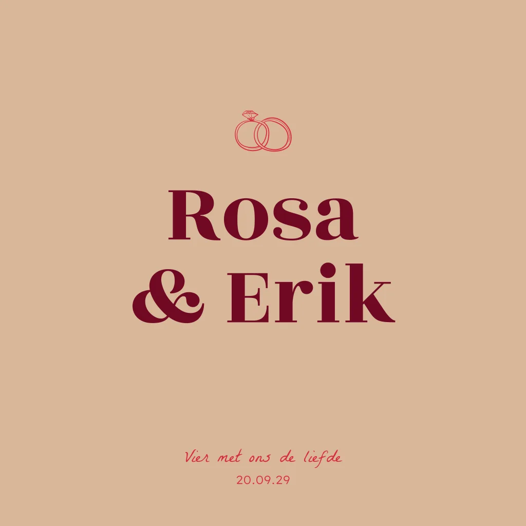 Trouwkaart in beige en roodtinten met een illustratie van ringen. Door deze kleurencombinatie is deze kaart een unieke trouwkaart voor jullie bruiloft. Pas de kleuren, lettertypes en afbeeldingen makkelijk zelf aan in onze online editor.