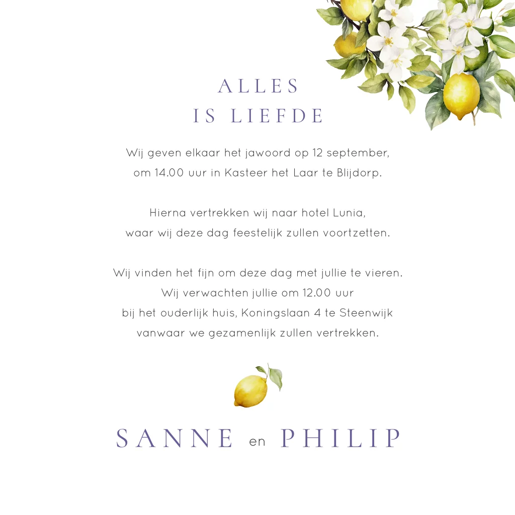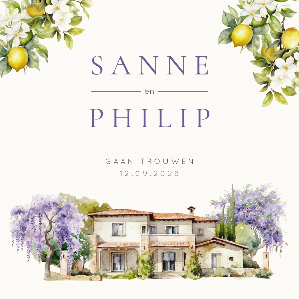 Deze stijlvolle aquarel trouwkaart met citroenen is een echte eyecatcher. Je ziet een aquarel beschildering van een Toscaans huis met blauwe regen. Bovenin de hoeken hangen citroenen met bloemen. Deze trouwkaart zal zeker opvallen en is perfect voor een Toscaanse bruiloft of elders in Italië of het buitenland.
