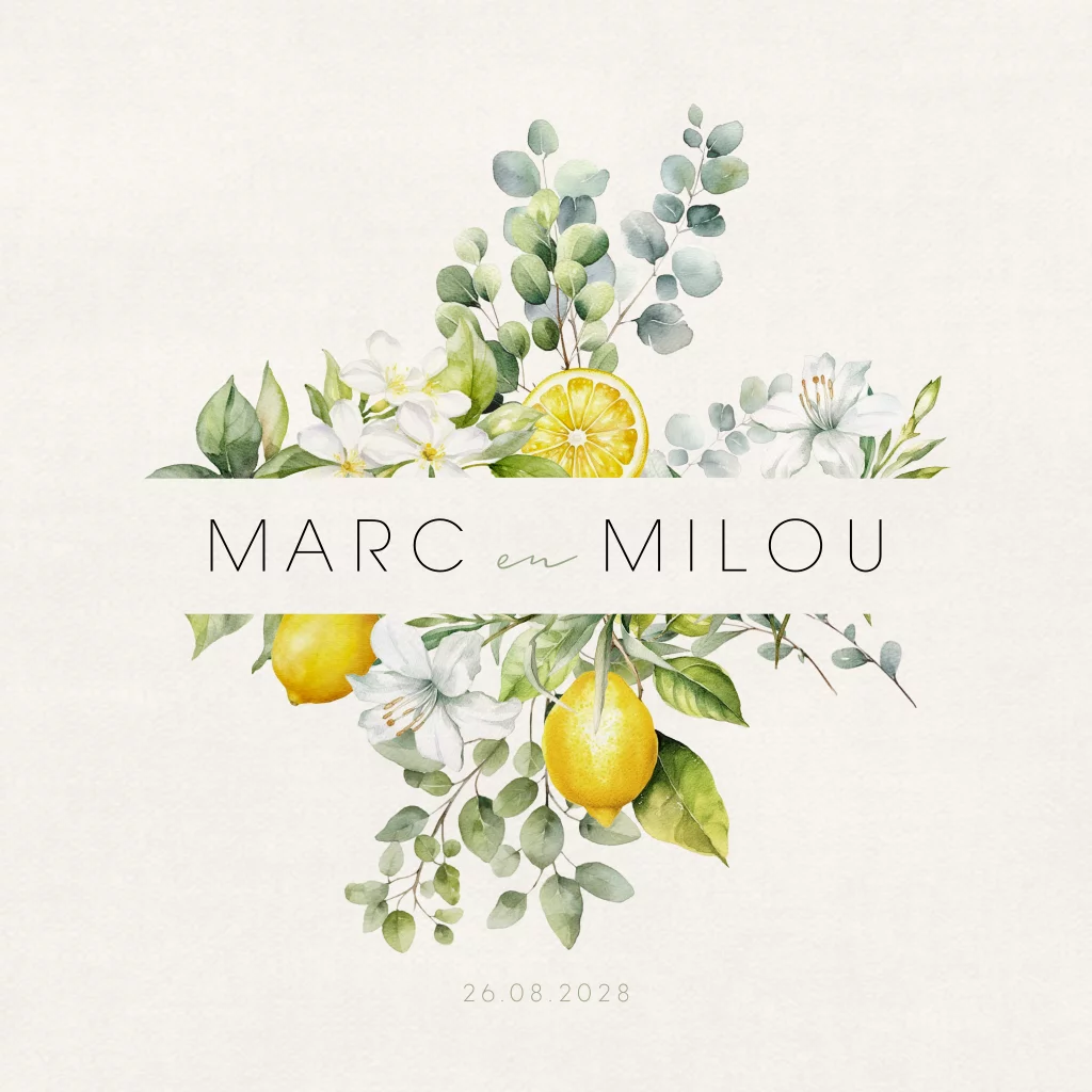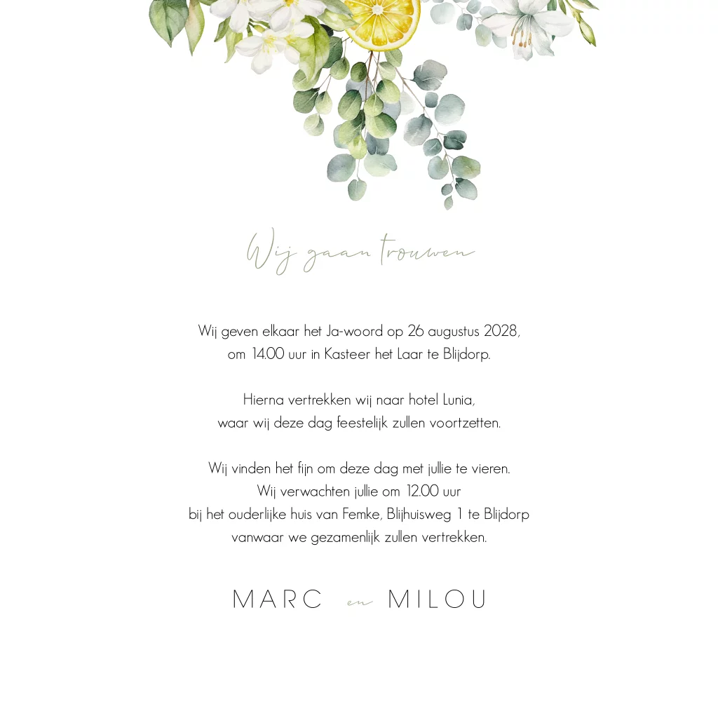 Citrus trouwkaart met citroenen en takjes met bloemen