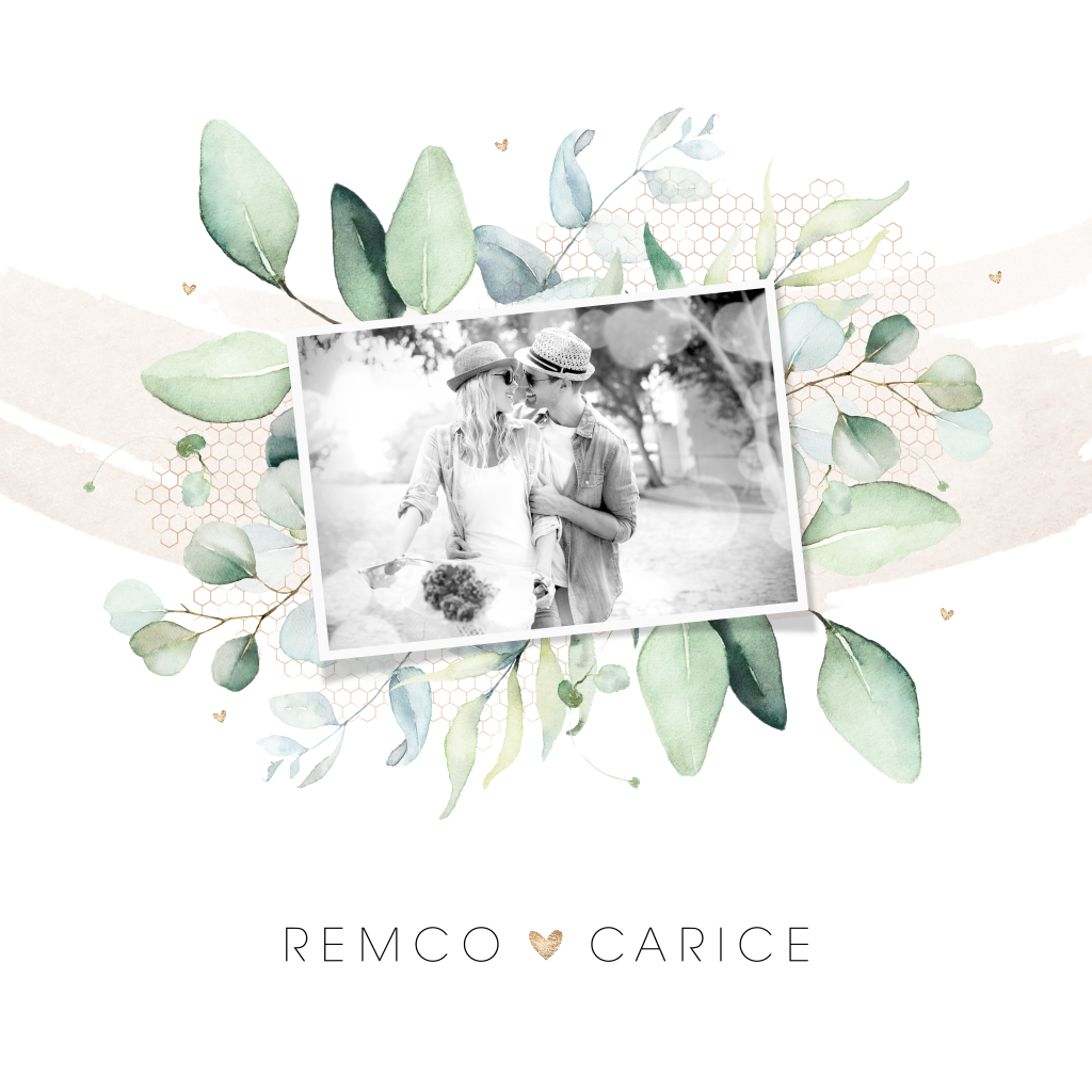 Rustige en cleane trouwkaart met eigen foto en stijlvolle botanische takjes. Deze huwelijksuitnodiging is onderdeel van onze trouwhuisstijl Classic Botanic.