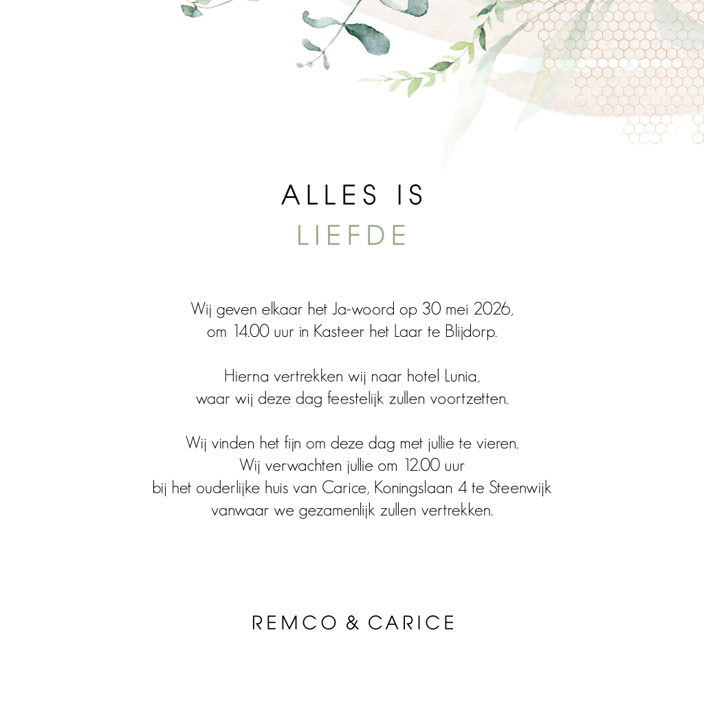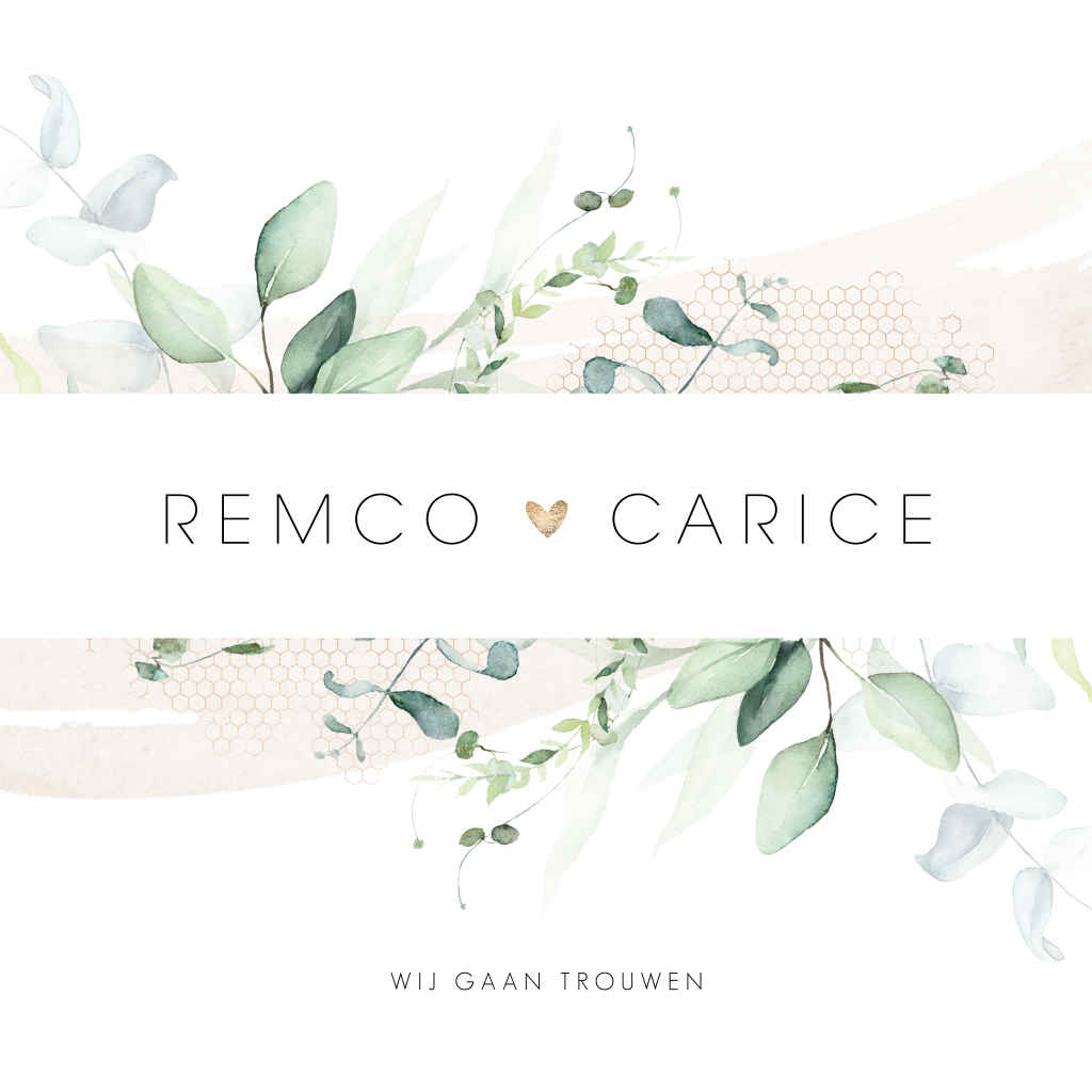 Rustige en cleane trouwkaart met stijlvolle botanische takjes. Deze huwelijksuitnodiging is onderdeel van onze trouwhuisstijl Classic Botanic.