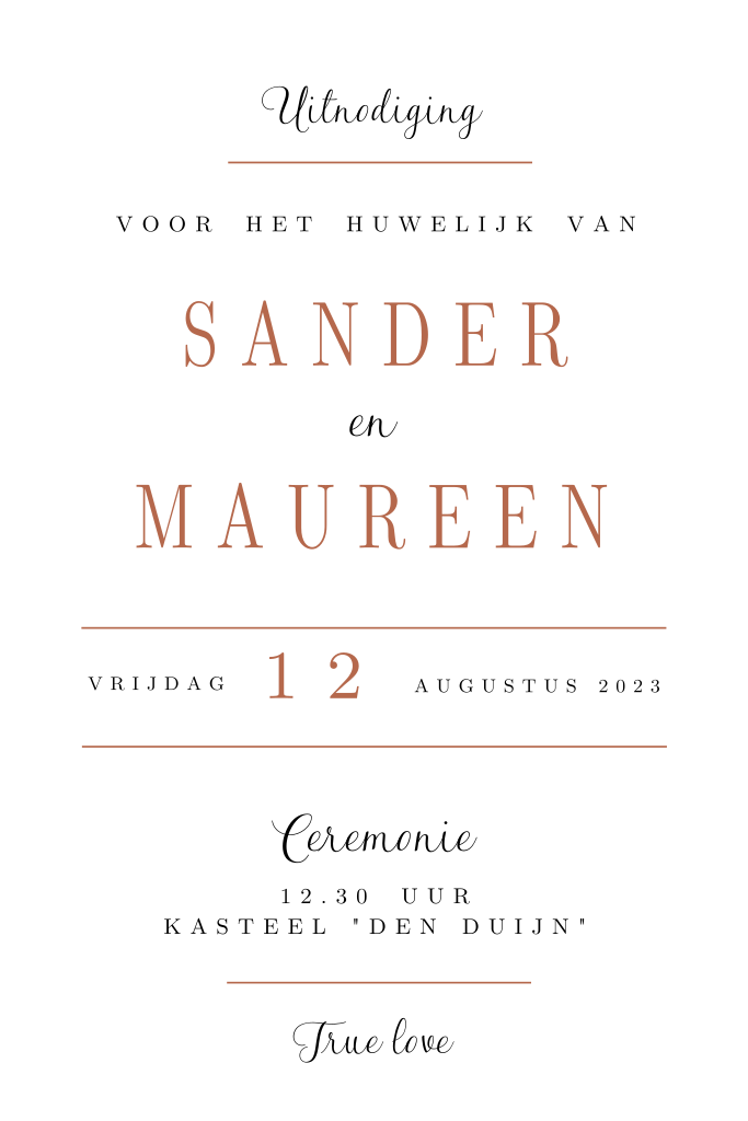 Rustige en cleane trouwkaart in wit met koperkleur. Deze huwelijksuitnodiging is typografisch opgemaakt en strakke letters zijn gecombineerd met sierlijke letters. De kaart oogt rustig, maar stijlvol en is onderdeel van onze trouwhuisstijl Clean Koper.