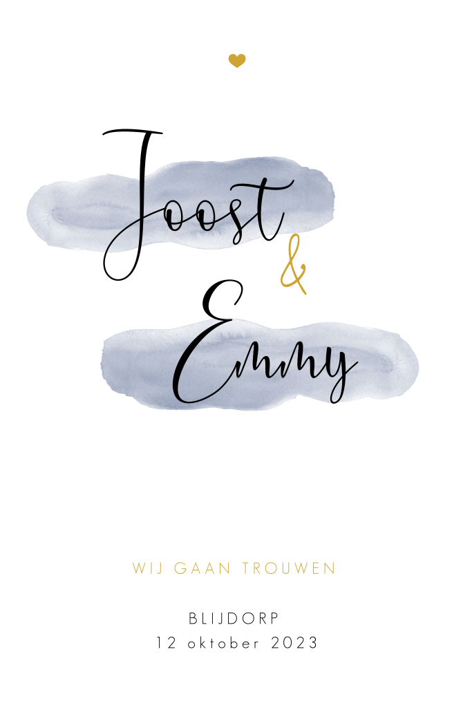 Trouwkaart met een klassiek tintje. De kaart is voorzien van aquarel en de namen staan in sierlijke letters. Gecombineerd met een klein goudkleurig hartje en goudkleurige tekst, blijft de kaart clean en rustig.