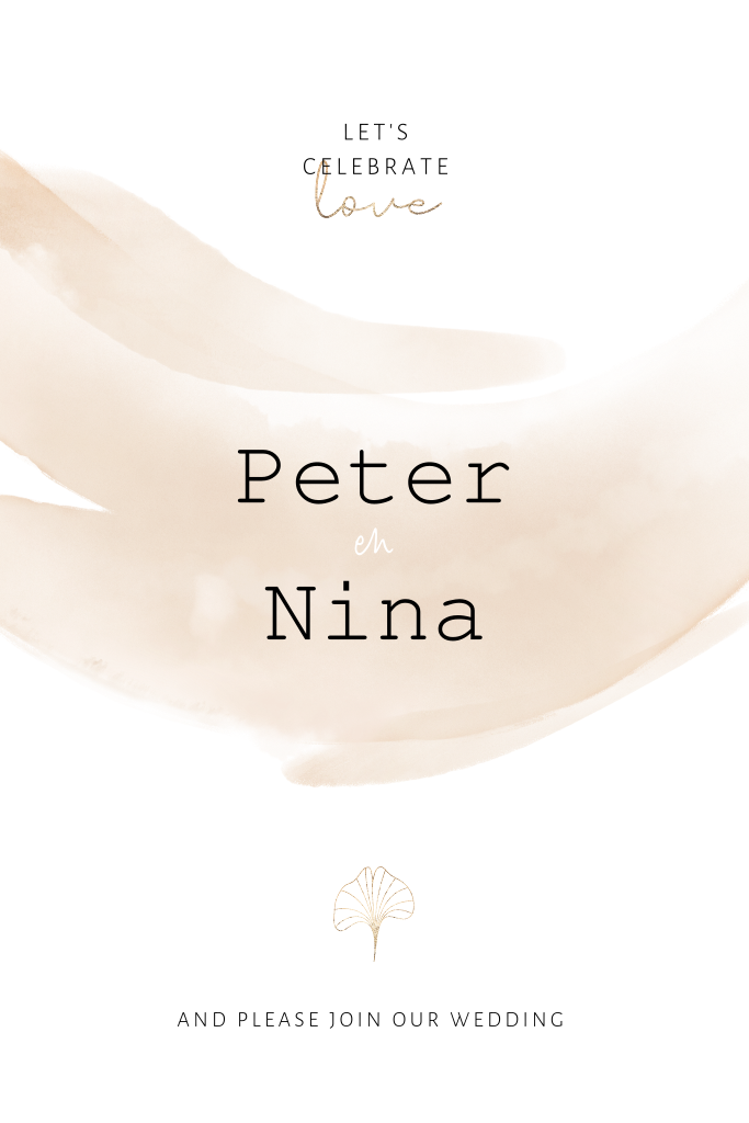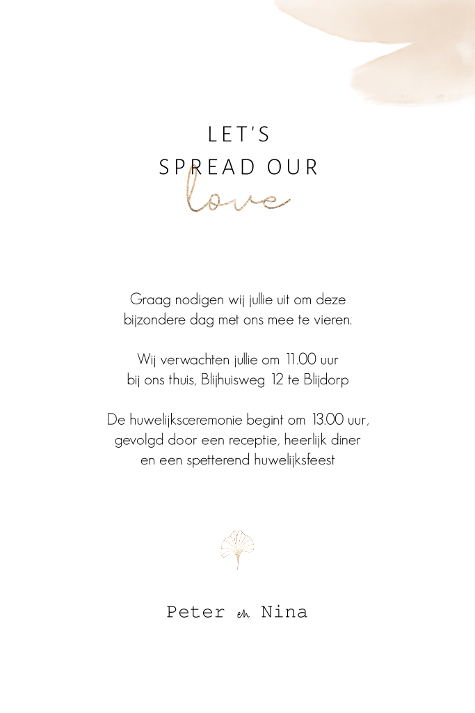Prachtige rustige trouwkaart met een bloem takje in goud. De minimalistische trouwkaart heeft een rustige uitstraling gecombineerd met sierlijke letters waarin love staat geschreven. De tekst aan de binnenkant is heel formeel, natuurlijk kan er ook gekozen worden voor een eigen tekst variant.