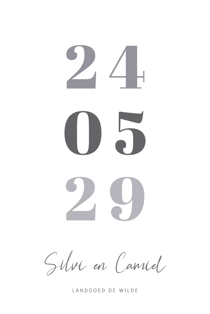 Cleane trouwkaart in zwart wit met de namen van het bruidspaar in mooie sierlijke letters. Deze kaart pas je eenvoudig aan naar je eigen wensen.