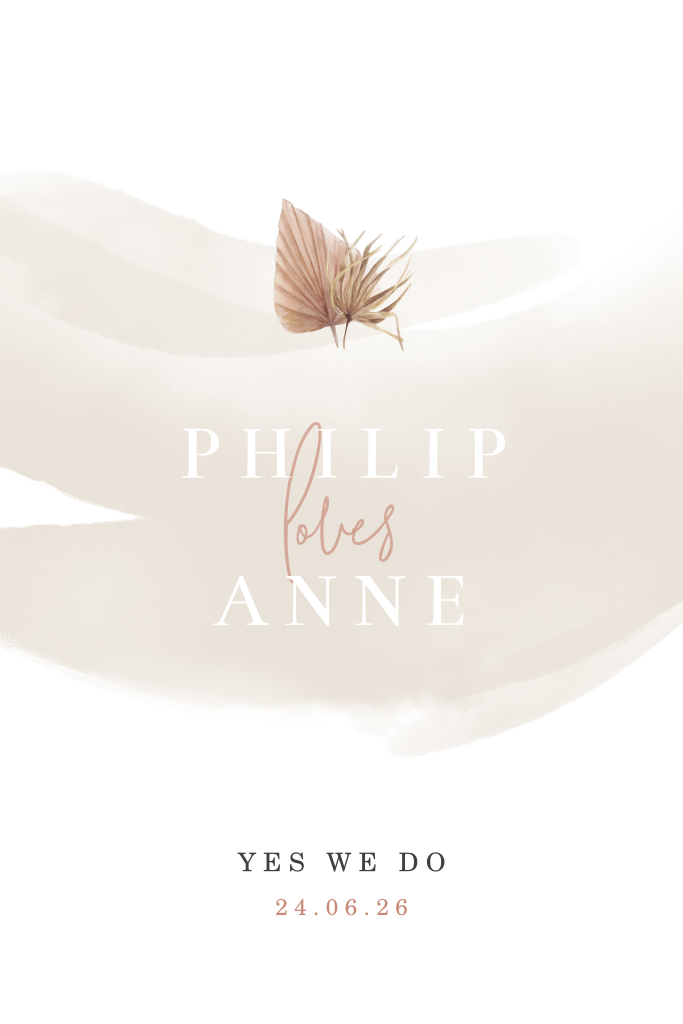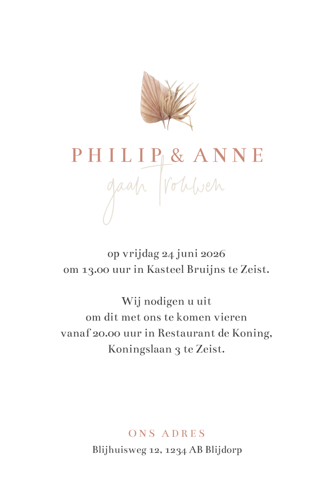 Hippe en stijlvolle trouwkaart met mooie gedroogde bloem takjes. Kleuren en lettertypes zijn aan te passen in de editor.