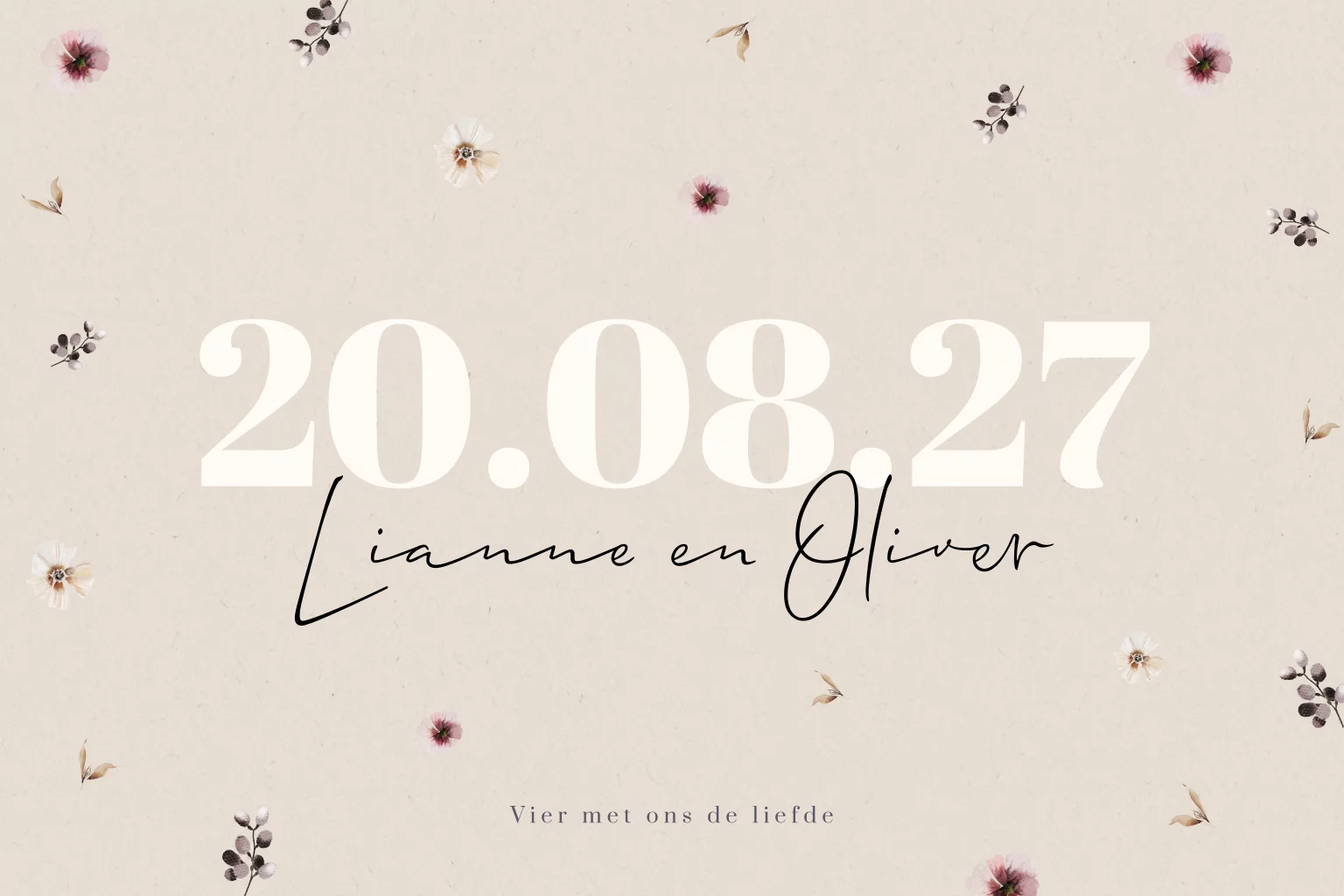 Romantische trouwkaart met droogbloemen. Deze trouwuitnodiging heeft een kartonlook achtergrond. Pas de teksten, lettertypes en kleuren eenvoudig aan in de editor. Hulp nodig bij het ontwerpen? Neem contact met ons op!