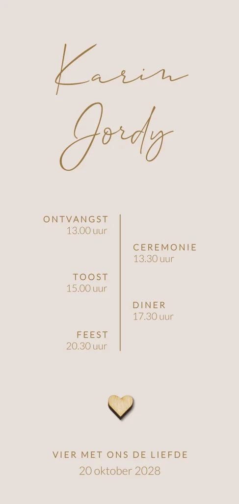 Op zoek naar een eenvoudige trouwkaart met een vleugje romantiek? Deze trouwkaart is precies wat je nodig hebt voor jullie grote dag. Met een prachtig echt houten hartje en een rustige achtergrond in zachte beige tinten, straalt deze uitnodiging een serene en liefdevolle sfeer uit. De tijdlijn geeft een speels tintje aan het ontwerp. Met de combinatie van eenvoud, stijl en romantiek is deze uitnodiging de perfecte keuze voor jullie bijzondere dag.