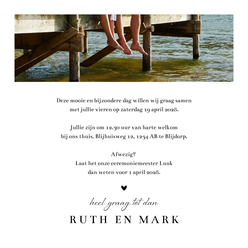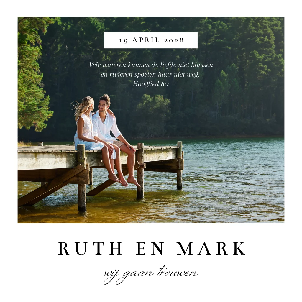 Deze prachtige trouwkaart is een unieke manier om jullie christelijke huwelijk aan te kondigen. Voeg jullie eigen foto toe aan deze trouwkaart voor een extra persoonlijke touch. In de foto zie je een Bijbeltekst staan en een wit kader voor jullie trouwdatum. De namen van het stralende bruidspaar staan onder de foto in een rustig zwart lettertype. Kleuren en lettertypes pas je gemakkelijk aan in onze online editor. Hulp nodig? Ons team helpt je graag!