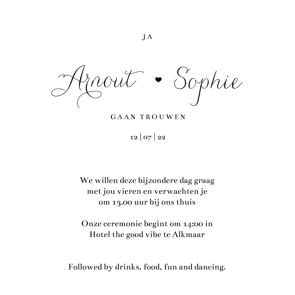 Stijlvolle huwelijksuitnodiging met sierlijke letters en foto. Deze trouwkaart is onderdeel van onze trouwhuisstijl Endless Love.