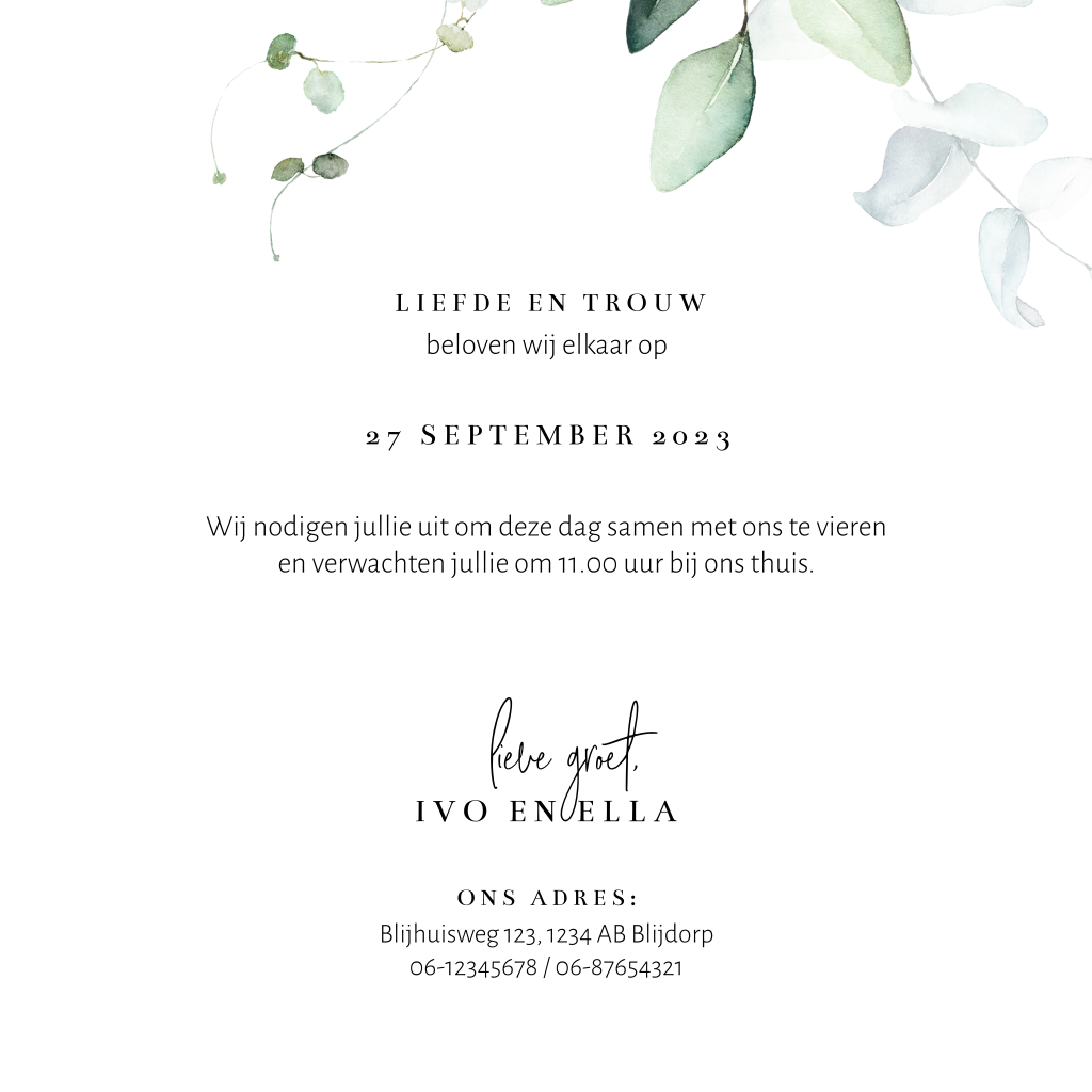 Hippe trouwkaart met een rustige uitstraling. Op deze huwelijksuitnodiging staan mooie aquarel eucalyptus takjes in zachte groene tinten. Maak van deze kaart je eigen persoonlijke huwelijksuitnodiging. Pas de teksten en lettertypes naar je eigen smaak aan in de editor.