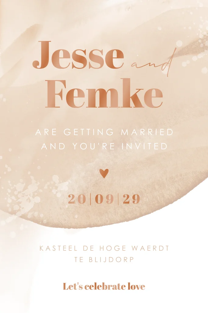 Met deze prachtige trouwkaart met ronde hoeken nodig je al jullie gasten uit voor jullie bruiloft! Op deze huwelijksuitnodiging staan aquarel vegen in een mooie nude tint en jullie namen in echt hoogglans. Hoogglans geeft deze kaart een luxe uitstraling. Pas de datum en jullie namen makkelijk aan in onze editor.