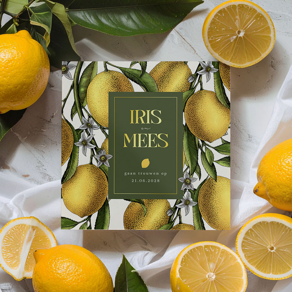 Op zoek naar een hippe en toch ook stijlvolle trouwkaart? Kies dan voor deze prachtige huwelijksuitnodiging met citroenen en goudfolie. Deze trouwkaart is perfect voor een bruiloft in de zomer of het buitenland, dankzij de vrolijke kleurencombinatie van het fruit en de bloemen. De dubbelzijdige foliedruk geeft een luxe uitstraling.