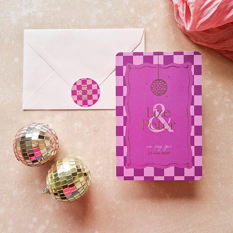 Op zoek naar een trendy en feestelijke trouwkaart met een vleugje glamour? Ontdek dan deze kleurrijke trouwkaart met foliedruk, afgeronde hoeken en een opvallende discobal. Goudfolie zorgt voor een extra vleugje luxe en de ronde hoeken voor een speels effect. Deze trouwkaart bevat een speels kader met een discobal en daaromheen een blokjespatroon. Pas eenvoudig de teksten en kleuren aan in onze handige online editor en creëer zo een persoonlijke trouwkaart die perfect past bij jullie trouwdag.