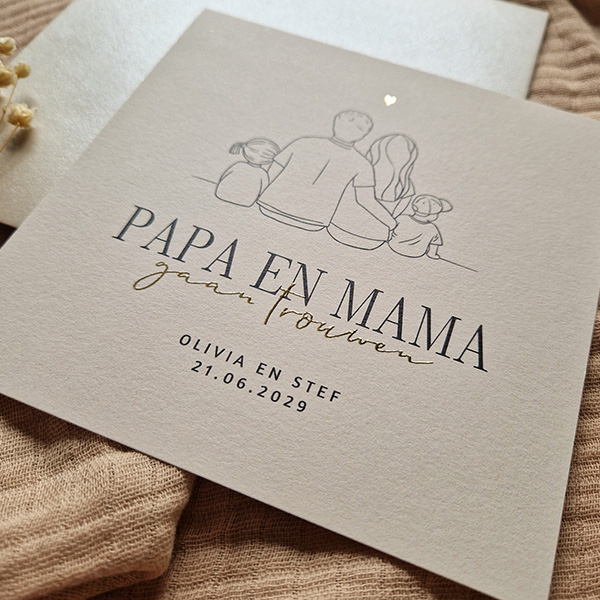 Een schitterende trouwkaart met een lijntekening van een gezin. Deze trouwkaart 'Papa en mama gaan trouwen' bevat goudfolie wat zorgt voor een extra vleugje luxe. De mooie warme zandkleur achtergrond gecombineerd met een zandkleur envelop maakt deze trouwkaart helemaal in stijl af. Laat jullie namen en trouwdatum stralen met deze prachtige trouwkaart. Deze lijntekening is ook mogelijk in een andere gezinssamenstelling. Hulp nodig? Ons team staat voor je klaar.